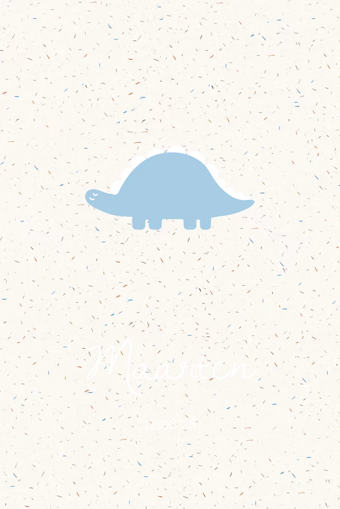 Lief geboortekaartje met blauwe dino, goudfolie en papiertextuur als achtergrond. Een vrolijk geboortekaartje voor jouw pasgeboren zoontje! Pas dit ontwerp eventueel zelf verder aan in onze handige editor.