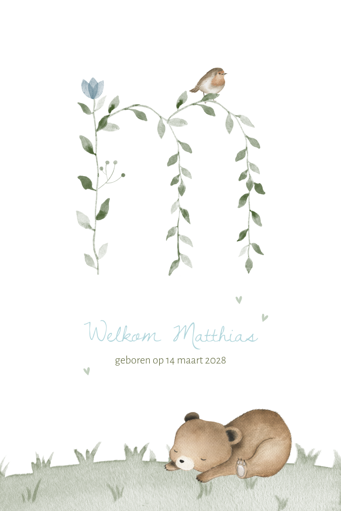Mooi met waterverf geschilderd geboortekaartje met initiaal van de naam van je zoon. De initiaal is opgebouwd uit lieve, groene blaadjes alsof het een tak is in de vorm van de letter. Je kunt de letters terugvinden bij de illustraties bij 'Cijfers en letters'. Ook de lieve waterverf beestjes staan los op de kaart en kun je vervangen.