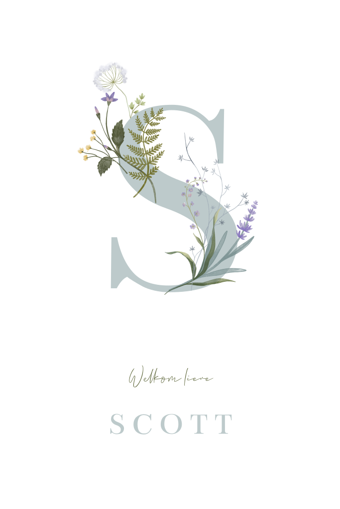 Trendy geboortekaartje met initiaal van de 1e letter van de naam van je zoon. De letter is omgeven met wilde bloemen en planten. Bij de illustraties staat een map met 'bloemen wild' die je allemaal zelf kunt toevoegen tot jouw design perfect is. Maak de kaart naar wens en bestel een drukproef.