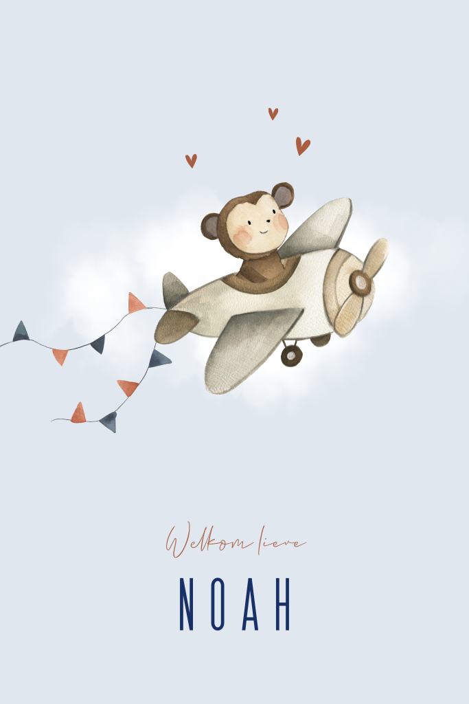 Ben je op zoek naar een leuk geboortekaartje om de geboorte van jullie zoon aan te kondigen? Kies dan voor dit lieve geboortekaartje met een waterverf illustratie van een lief aapje in een vliegtuig met slingers erachter. Je kunt de kaart zelf nog verder aanpassen met de designtool.