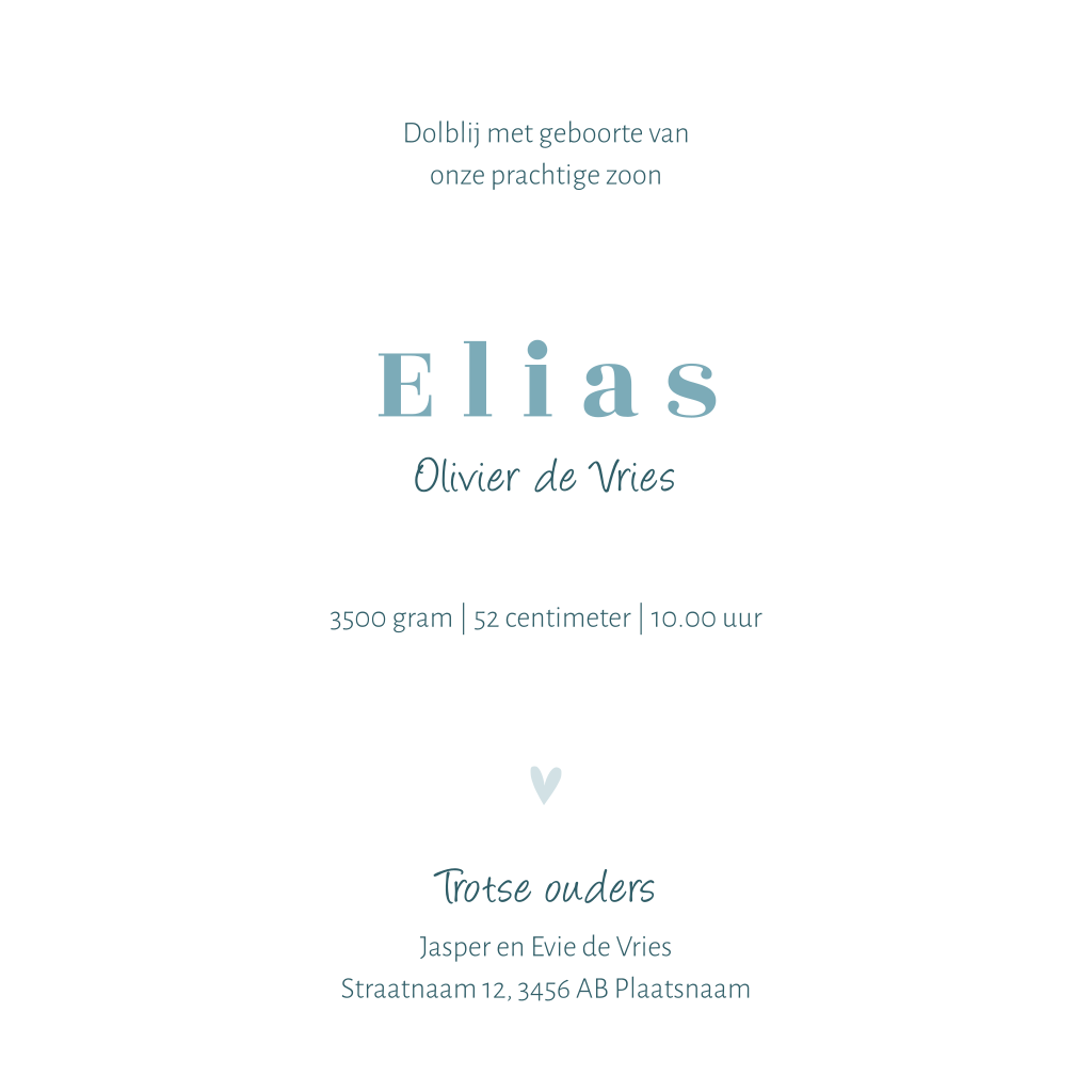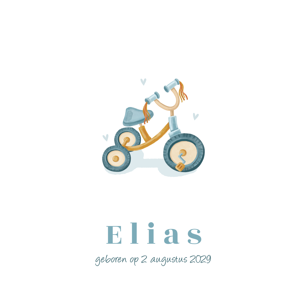 Lief geboortekaartje met blauw driewielertje voor een klein jongetje. Het fietsje kan als symbool staan voor het mooie avontuur waar jullie samen aan gaan beginnen! Aan de binnenzijde is ruimte voor een foto van je pasgeboren zoontje. Pas dit kaartje helemaal aan naar eigen wens met behulp van onze handige editor. Bestel een proefdruk om dit witte geboortekaartje in het echt te kunnen bewonderen.