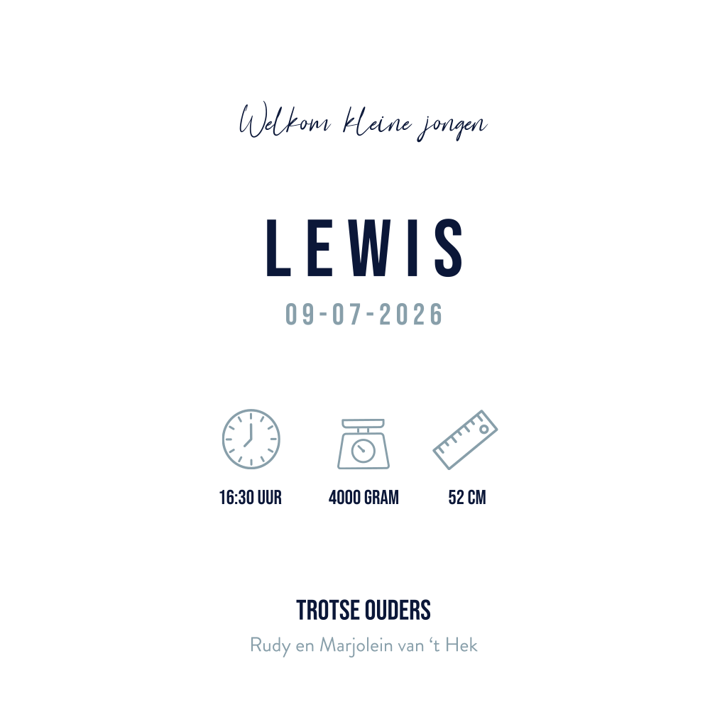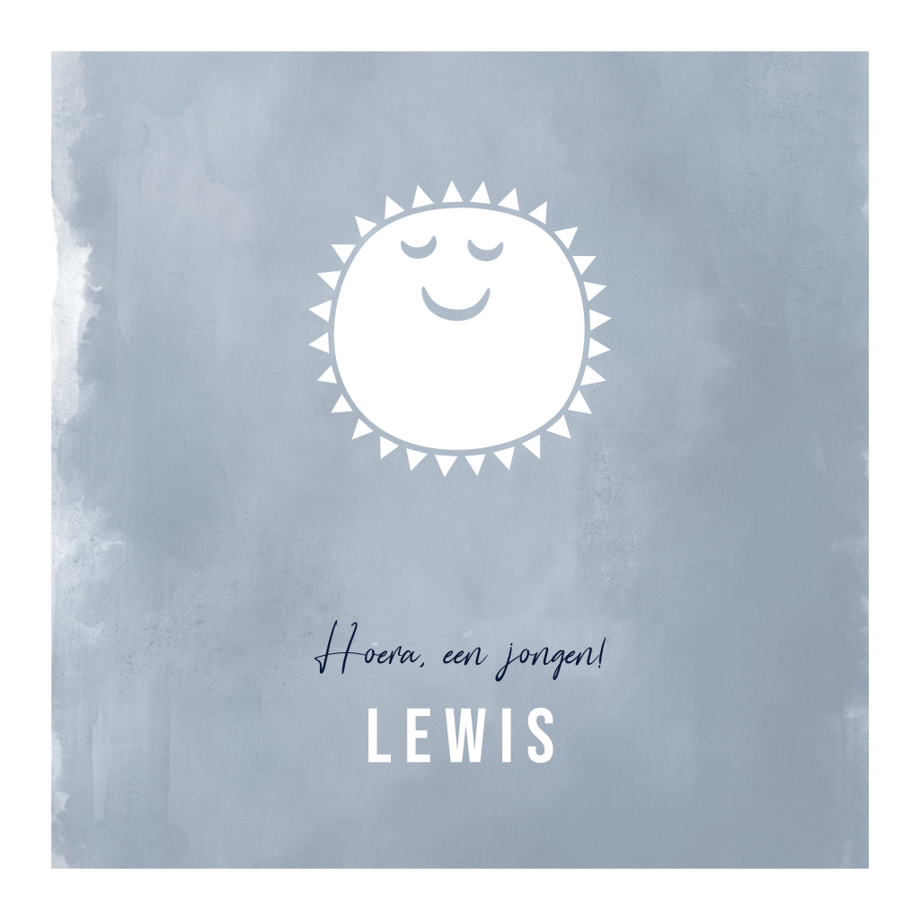 Geboortekaartje met blauwe waterverf een lief zonnetje voor een jongen. De kaart op vierkant formaat heeft een grijsblauwe achtergrond van waterverf met een dun wit kader. Onder de illustratie van het zonnetje staat de naam van je zoontje. Pas het ontwerp naar wens aan in onze handige ontwerptool. Zo kun je lettertypes en kleuren personaliseren.