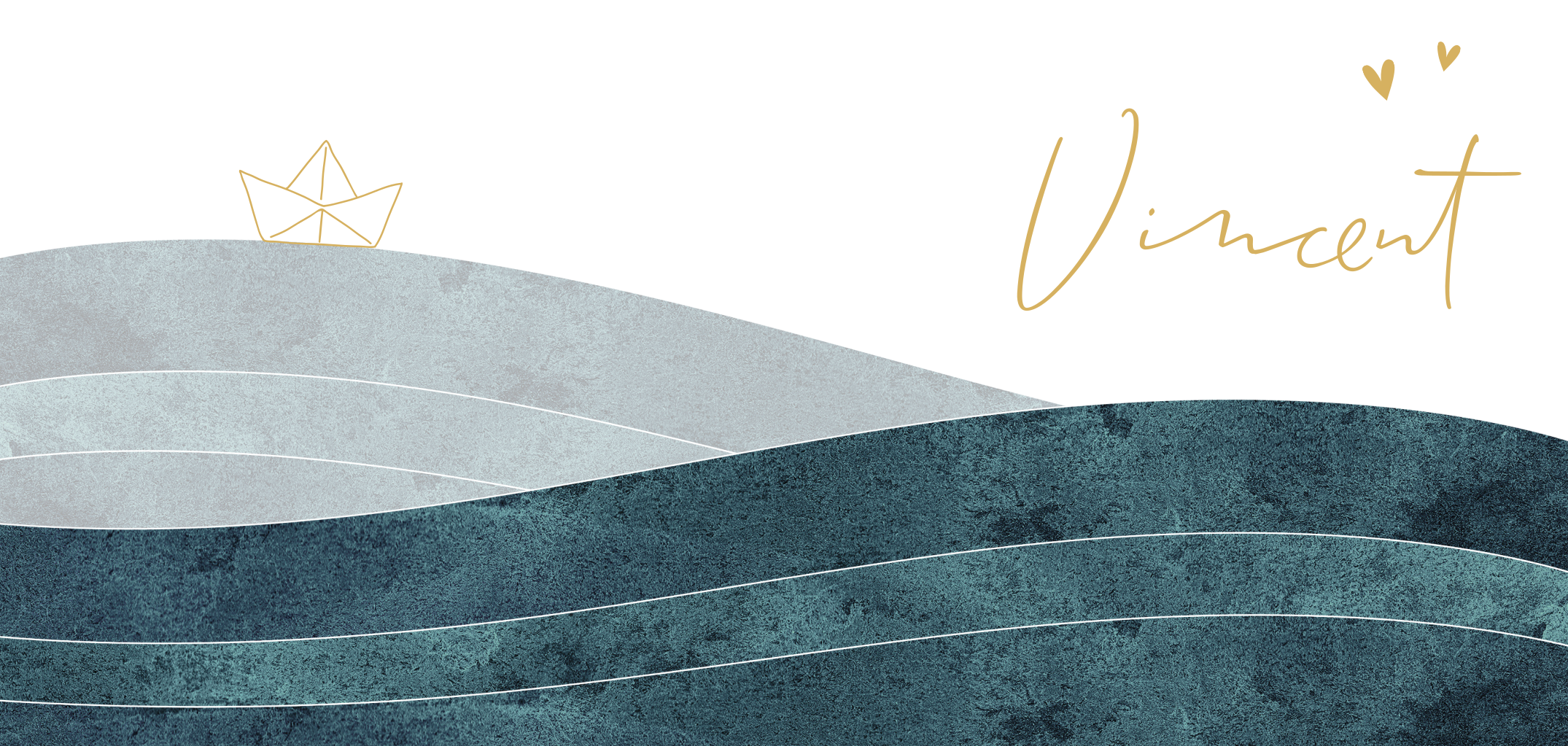 Een bijzonder geboortekaartje met blauwe golven met een papieren bootje. Leuk liggend geboortekaartje om de komst van je pasgeboren zoontje op een unieke manier aan te kondigen. Verander eventueel de lettertypes naar eigen inzicht met onze handige ontwerptool.