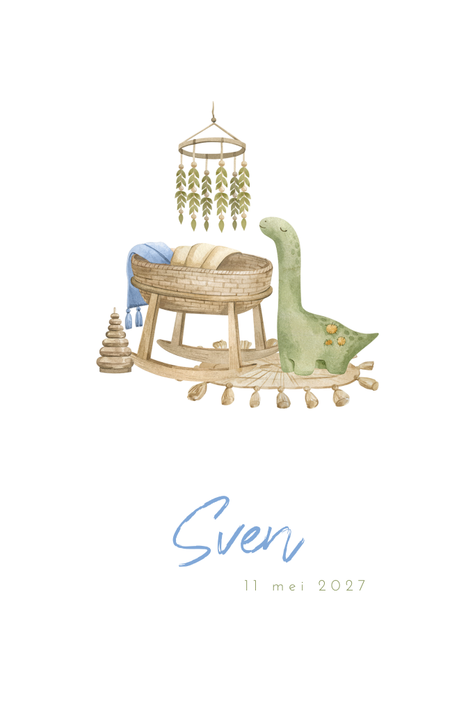 Geboortekaartje jongen met brontosaurus bij wieg