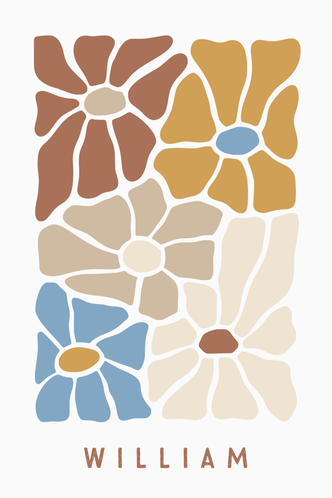 Op zoek naar een geboortekaartje voor je kleine jongen? Ga voor dit retro ontwerp met eclectic bloemenpatroon in bruine en blauwe tinten. Pas de kleuren van de bloemen zelf aan in onze handige editor en bestel een proefdruk.