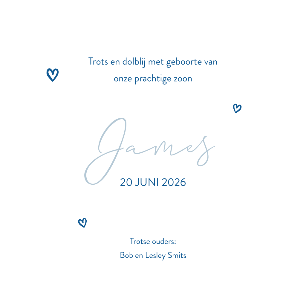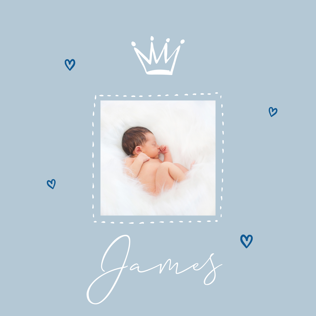 Blauw geboortekaartje met kroon en foto van je pasgeboren zoontje. Op dit leuke kaartje zie je een kroontje staan, Daarnaast kan je in het kader een mooie foto van je zoontje plaatsen. Hier en daar staan nog wat hartjes om de kaart helemaal af te maken. Binnenin de kaart is genoeg ruimte voor alle informatie. Bestel een proefdruk om het ontwerp in het echt te kunnen bekijken.