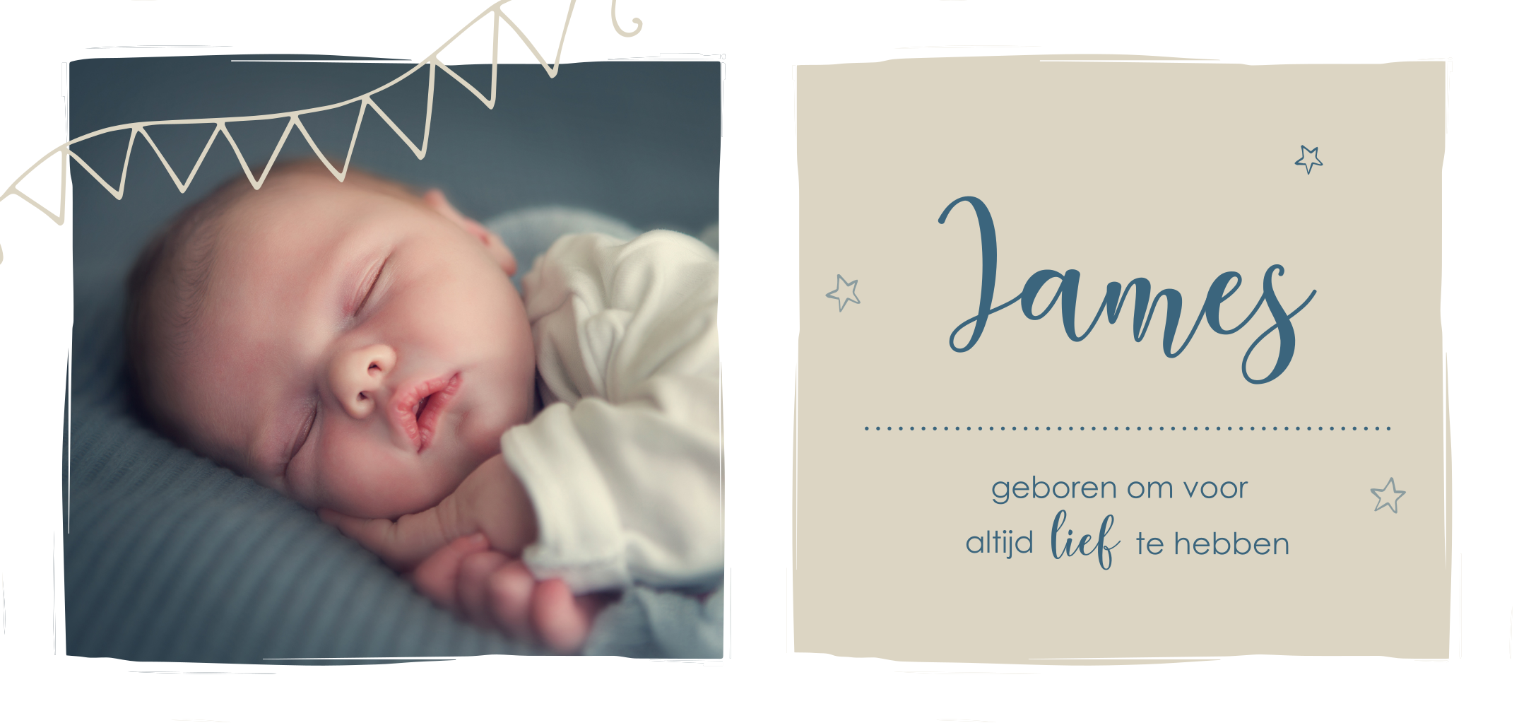 Beige foto geboortekaartje jongen met slinger en sterren
