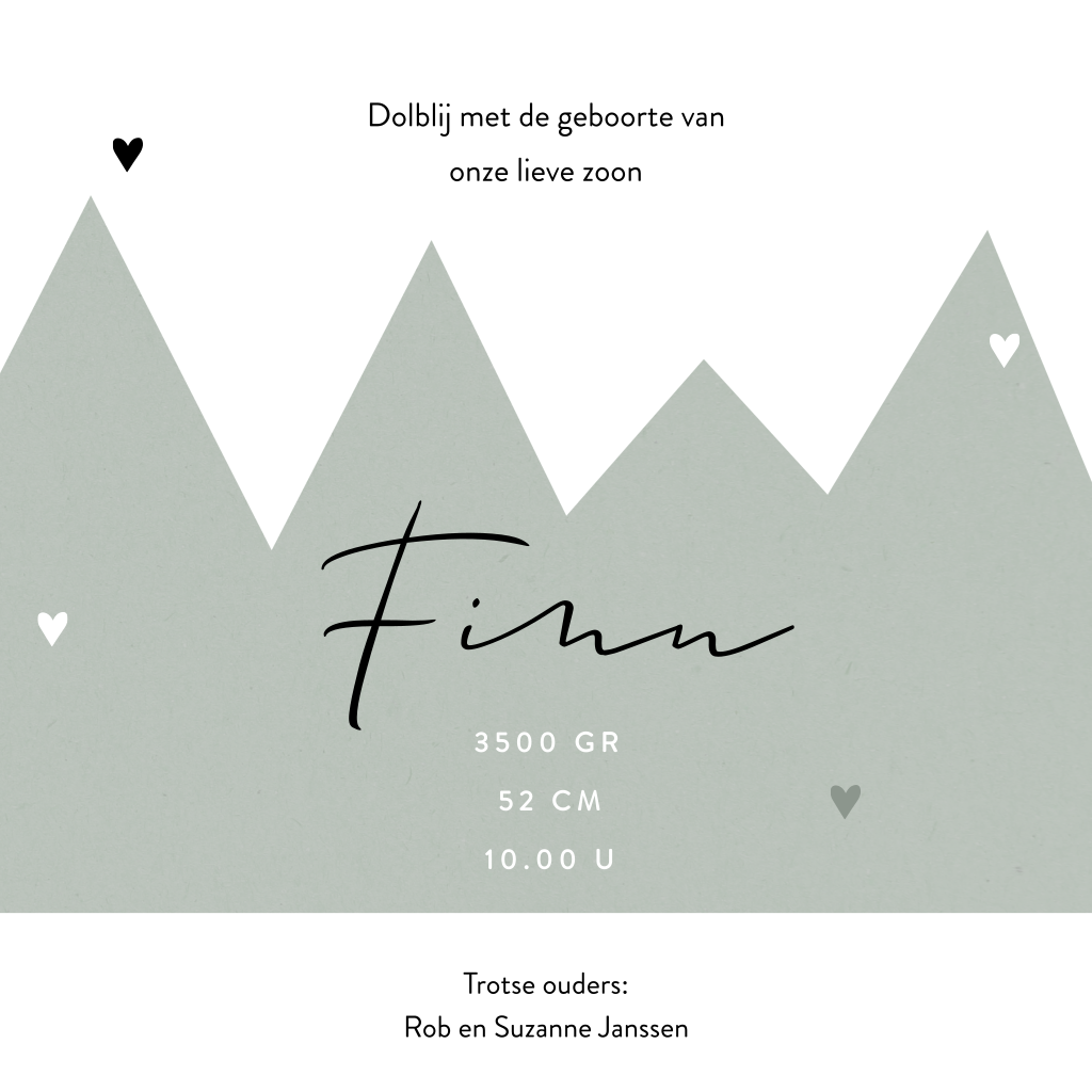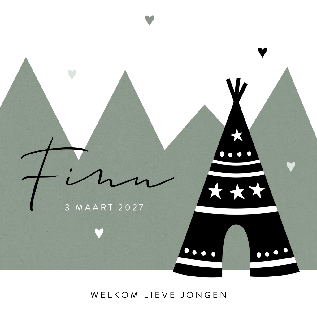 Een groen geboortekaartje met grafische bergen, kleine hartjes en een getekende tipi. De speelse typografie maakt het kaartje helemaal af. Aan de binnenzijde van dit vierkante ontwerp is ruimte voor een mooie foto van je kleintje. Pas de teksten aan met behulp van onze ontwerptool.