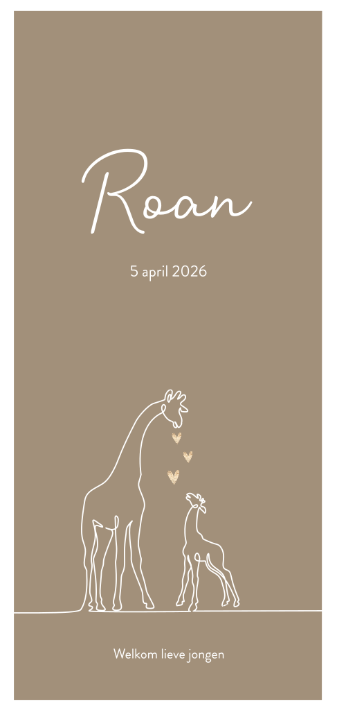 Hip geboortekaartje met lijntekening van twee girafjes voor je pasgeboren zoon. Stijlvol geboortekaartje met bruine achtergrond en wit kader. Op de kaart is een lijntekening van een grote en een kleine giraf te zien, omringd door goudkleurige hartjes. Met een speels lettertype staat de naam van je zoontje groot bovenaan de kaart. Pas de achtergrondkleur eventueel naar wens aan en bestel een drukproef om de kaart in het echt te zien.