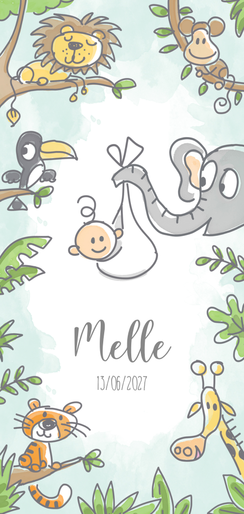 Langwerpig geboortekaartje met jungle dieren en lichtblauwe waterverf achtergrond. Ben jij dol op het jungle thema? Kies dan voor dit vrolijke kaartje met een leeuw, olifant, giraf, tijger en aap. Alle populaire dieren staan erop. Ook leuk om twee lettertypes met elkaar te combineren voor de naam en geboortedatum van je zoontje. Op de achterzijde is ruimte voor de geboortegegevens en alle overige informatie.