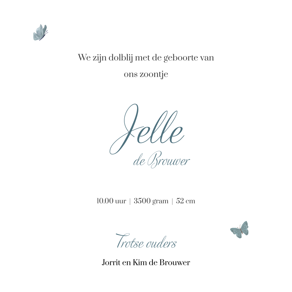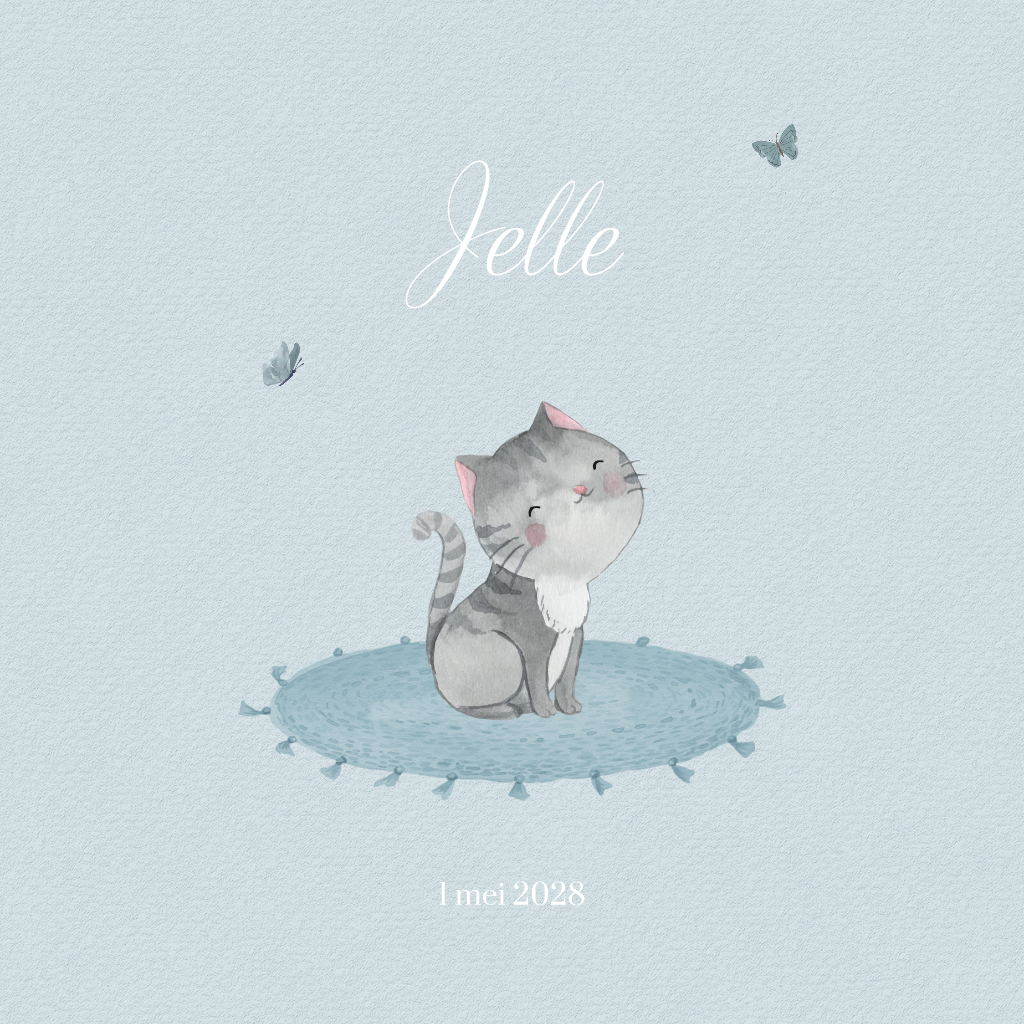 Op zoek naar een leuk geboortekaartje met een poesje erop? Kondig de geboorte van je zoontje aan met dit lieve geboortekaartje met een grijs poesje op een zachtblauwe achtergrond. Aan de binnenzijde ligt het poesje lief te slapen op een kleedje.