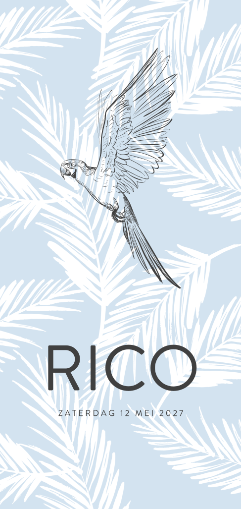 Dit langwerpige geboortekaartje heeft een strakke en tropische uitstraling door het gestileerde patroon met palmbladeren. De lichtblauwe kleur zorgt ervoor dat het kaartje zowel lief als grafisch oogt. Pas de kaart geheel naar wens aan in onze handige ontwerptool. Bestel vervolgens een drukproef om het gedrukte resultaat te bekijken.