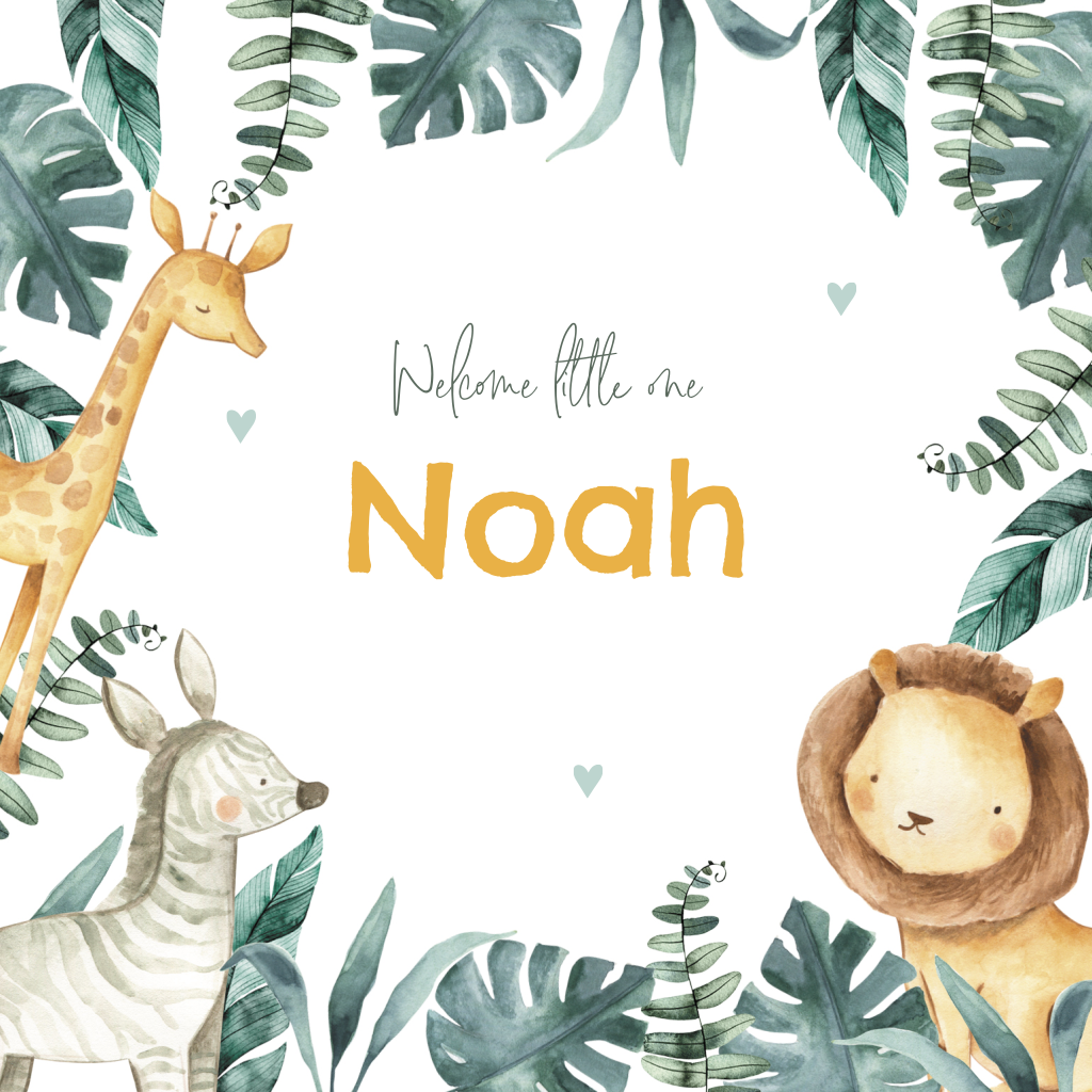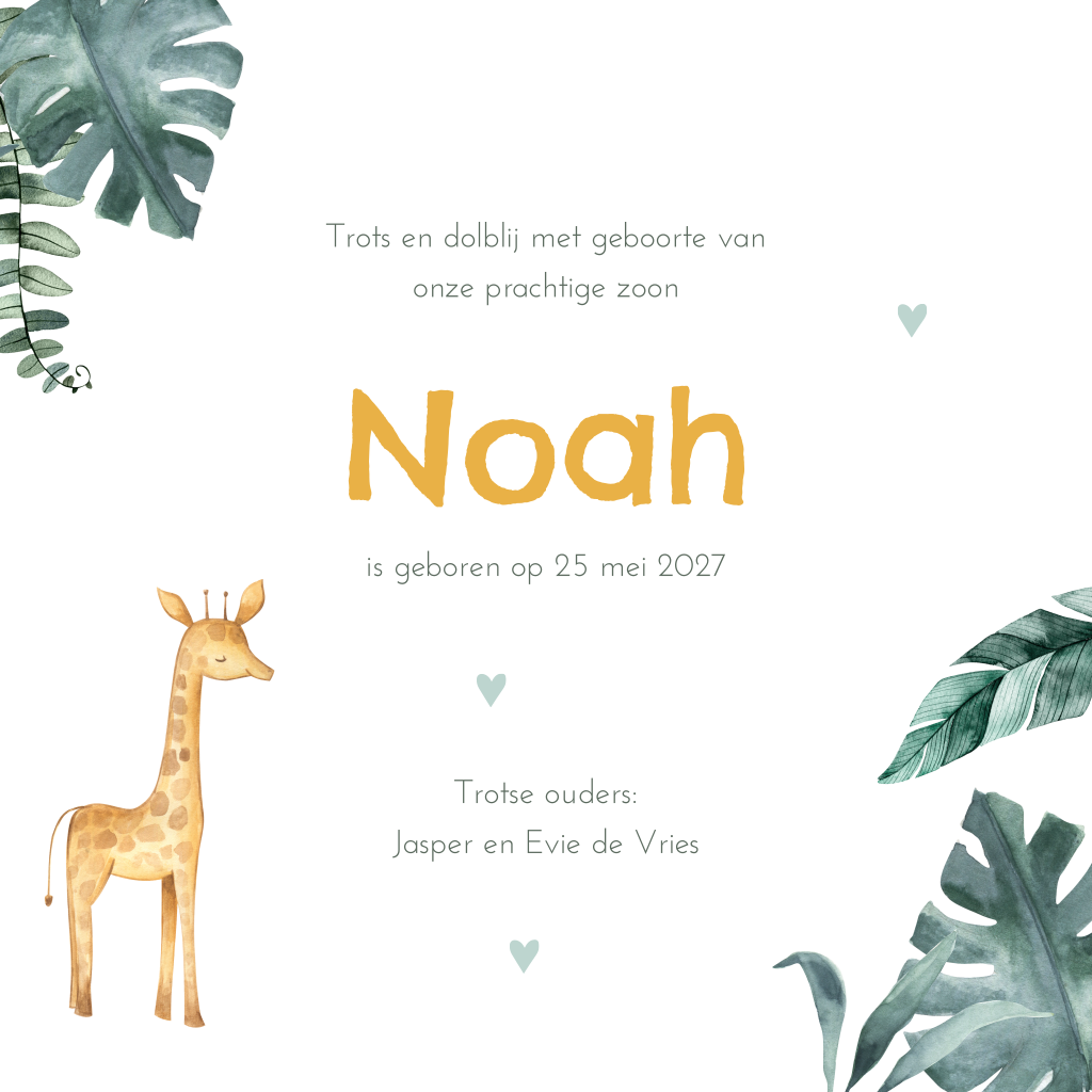 Is er een jongen op komst? Dit vierkante geboortekaartje met safari dieren en tropische bladeren is superleuk voor een jongen. Op de voorkant zie verschillende dieren tussen de bladeren verstopt zitten, zoals een giraf, een leeuw en een zebra. Wanneer je de kaart openvouwt zie je de bladeren terug komen. Daarnaast is er genoeg ruimte voor een gedichtje en alle informatie over je zoontje. Pas de lettertypes en kleuren aan en maak je kaartje helemaal uniek.