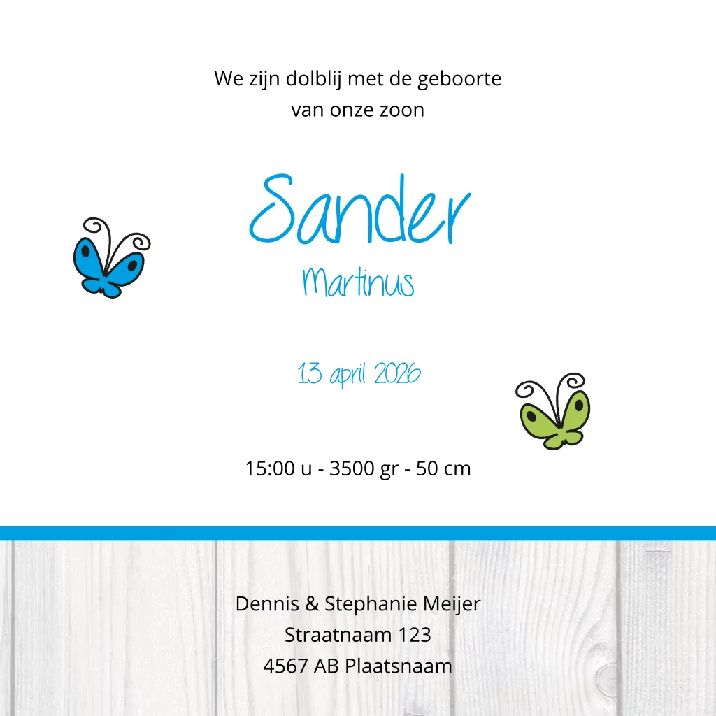 Vierkant geboortekaartje met een schaapje blauw met vlinders. Op dit schattige babykaartje zie je een lammetje voor een houtlook achtergrond. Om het lammetje vliegen gekleurde vlinders. In de balk onderin kan je de naam van je zoontje plaatsen.