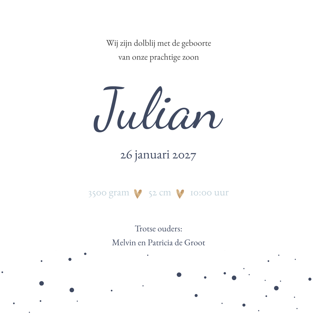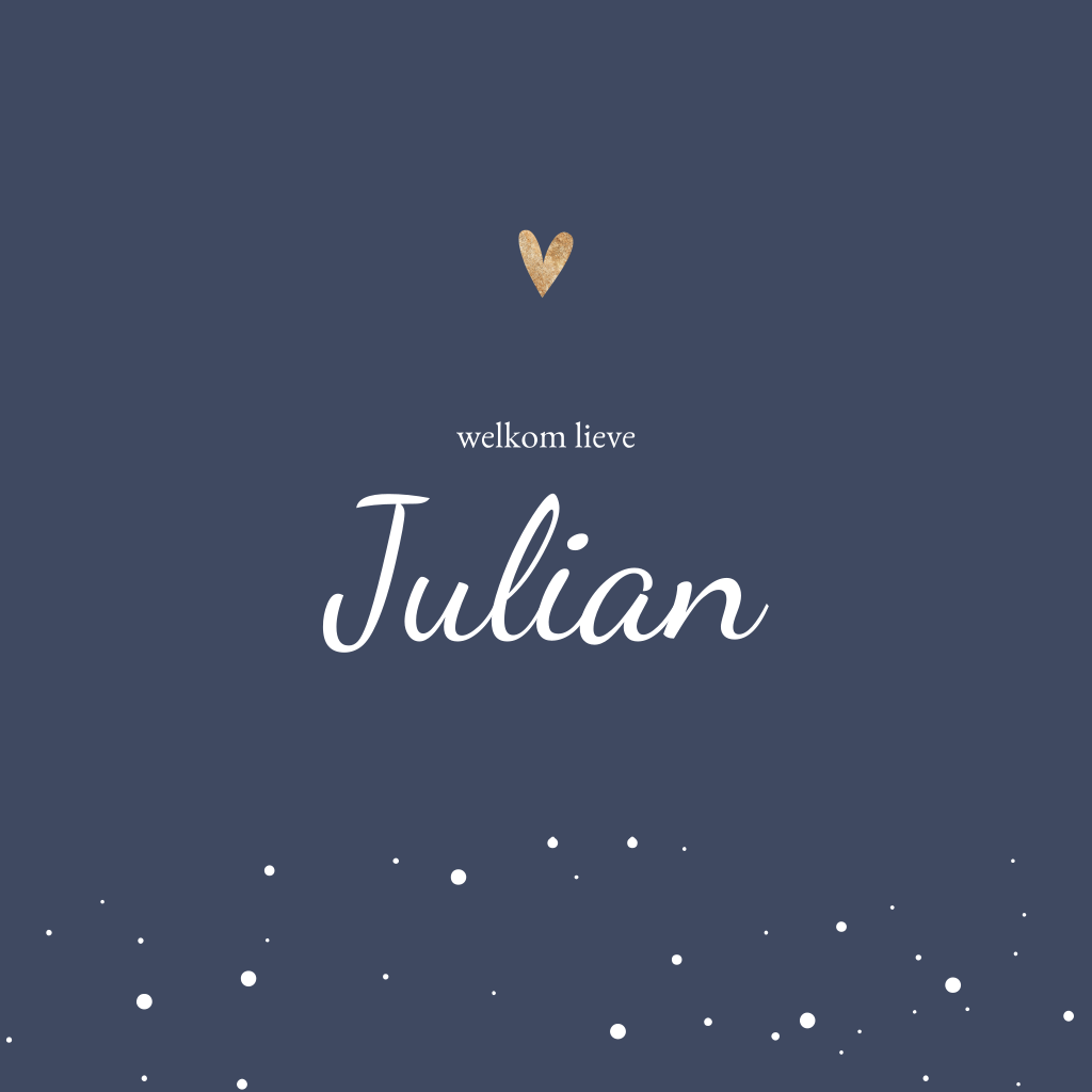 Vierkant geboortekaartje met blauwe achtergrond. De kaart heeft een rand met stipjes aan de onderzijde en heeft een goudkleurig hartje bovenaan de kaart. Met een speels lettertype plaats je de naam van je zoon voorop de kaart. In de ontwerptool pas je het kaartje helemaal naar wens aan. Je kunt de achtergrondkleur en lettertypes aanpassen.
