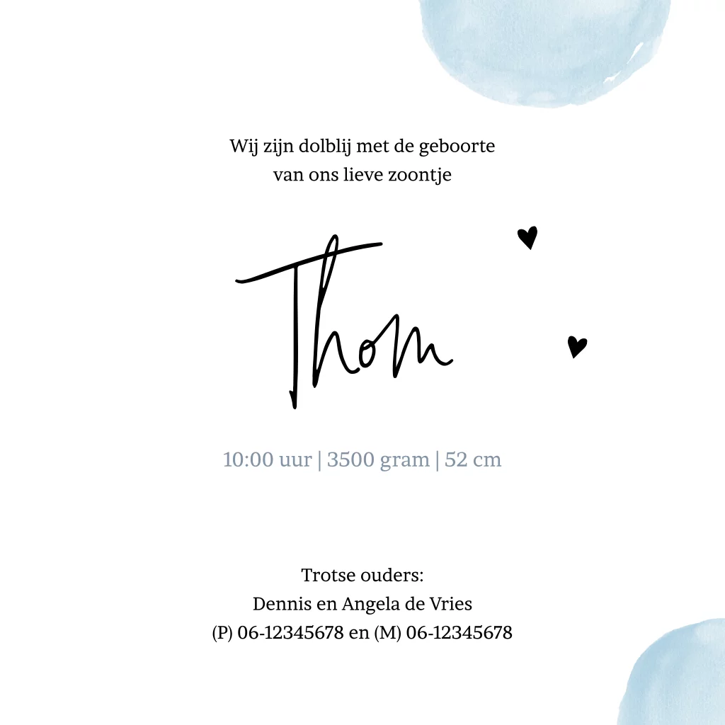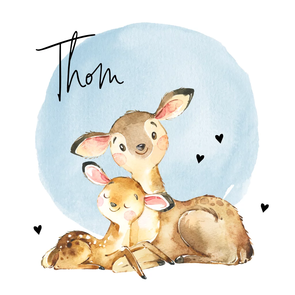 Lief geboortekaartje voor een jongen met blauwe cirkel van waterverf en twee schattige hertjes. De twee hertjes zijn versierd met kleine hartjes. Met een hip lettertype staat de naam van je pasgeboren zoontje voorop de kaart. In de kaart is ruimte voor een mooie oneliner en alle geboortegegevens.