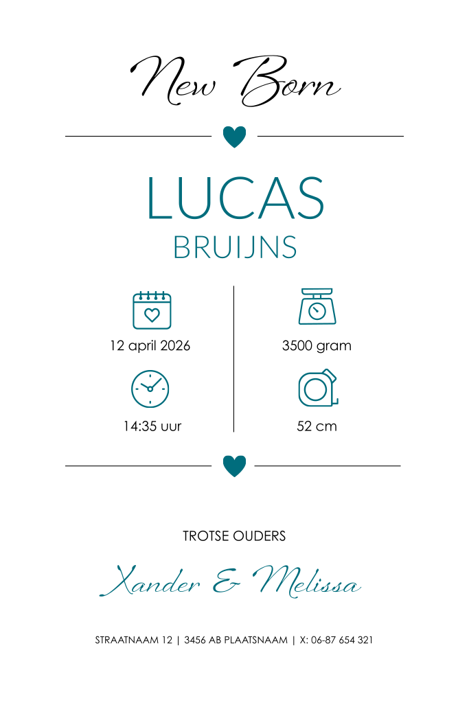 Ben je opzoek naar een klassiek geboortekaartje voor je pasgeboren zoontje? Wellicht is dit ontwerp dan wat voor jou! Strakke en sierlijke lettertypes wisselen elkaar af en op de achterkant kan je een mooie grote foto van je zoontje plaatsen. Op dit klassiek geboortekaartje voor een jongen staan leuke icoontjes om de geboortegegevens te noteren. bestel een drukproef om de kaart eerst in het echt te zien.