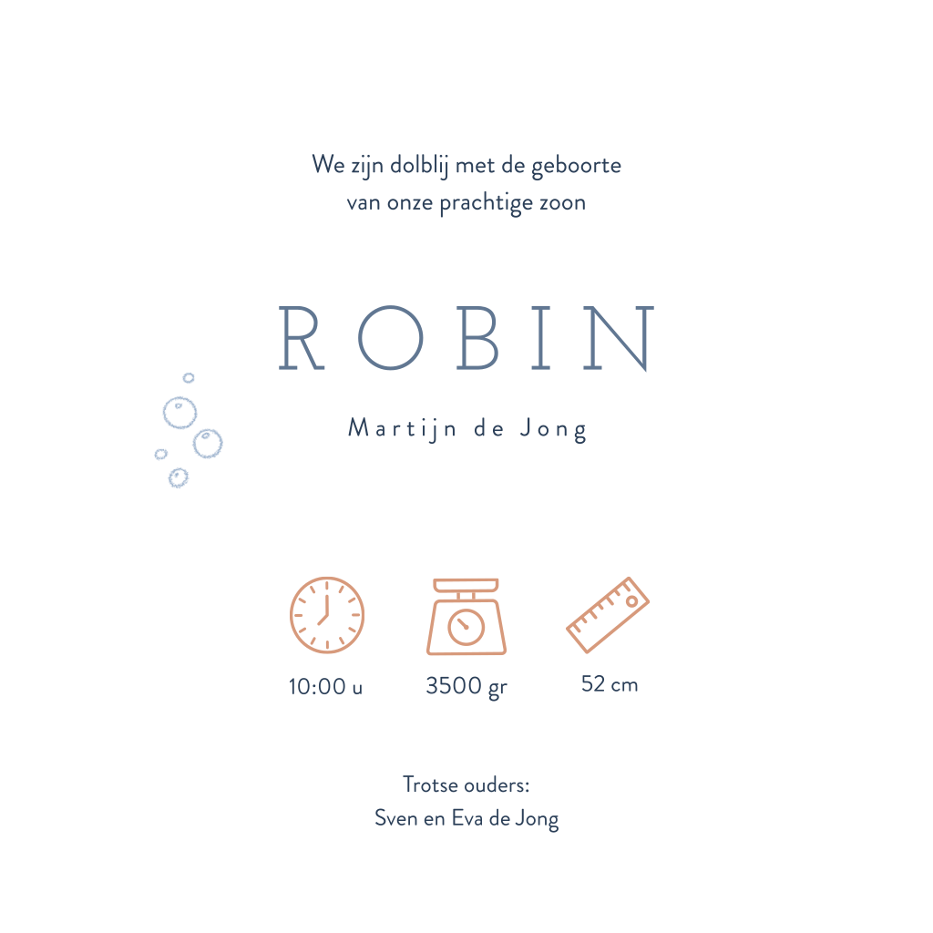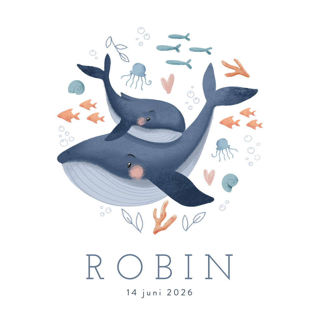 Geïllustreerd geboortekaartje voor de komst van een jongen met walvis en baby walvisje in een cirkel met visjes. Het thema onderwater is momenteel helemaal hip. Daarom hebben de ontwerpers van Koningkaart dit lieve geboortekaartje getekend. Je ziet twee walvisjes, omringd door zeewier, hartjes en andere zeedieren, zoals een kwal en verschillende visjes. Pas het kaartje naar wens aan door bijvoorbeeld de lettertypes te veranderen.