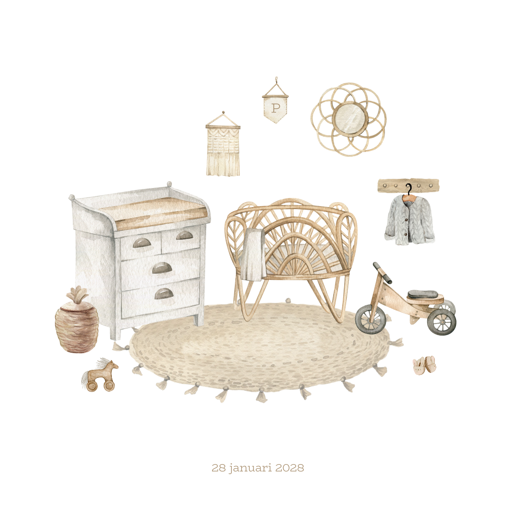 Stijlvol geboortekaartje met waterverf babykamertje en goudfolie. Met de afbeeldingen in de map 'Waterverf babykamer' kun je zelf dit kamertje aanpassen naar je eigen smaak. De goudfolie naam maakt dit ontwerp helemaal af. Aan de binnenzijde is er ruimte voor een lief gedichtje.