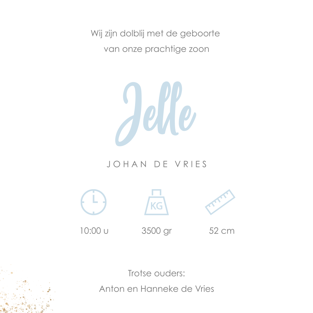Lief geboortekaartje op vierkant formaat met zachtblauwe waterverf en goudkleurige spetters. Met een hip lettertype staat de naam van je pasgeboren zoontje voorop de kaart. De kaart is versierd met goudkleurige hartjes. Binnenin is ruimte voor een gedichtje en de geboortegegevens.