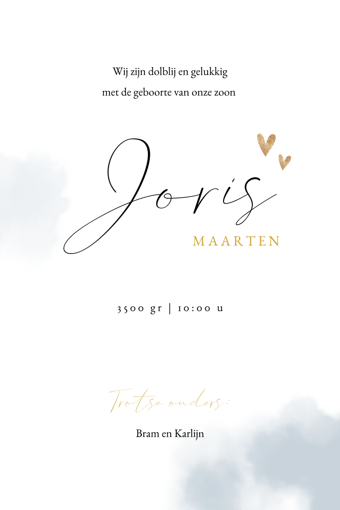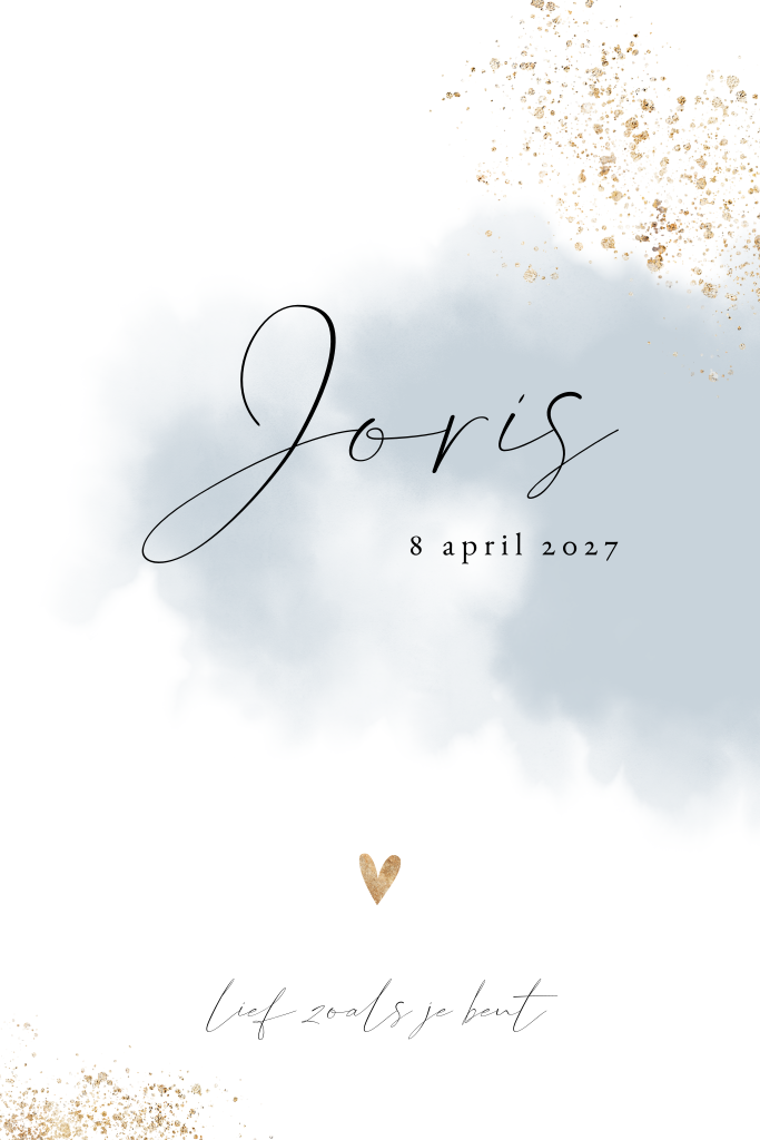 Mooi geboortekaartje met blauwe, dromerige waterverf als achtergrond. De kaart is versierd met goudkleurige hartjes en spetters voor een stijlvol resultaat. Je kunt de tekst naar eigen voorkeur aanpassen. Bestel een drukproef en bekijk het resultaat in het echt!