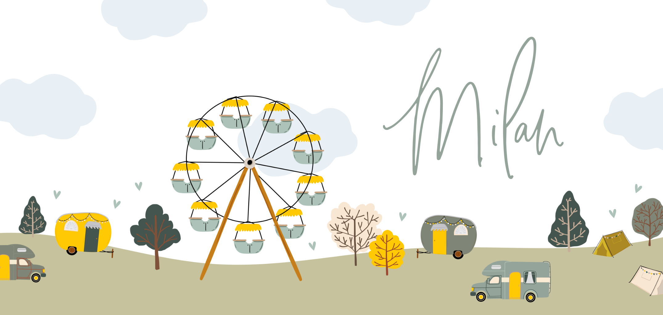 Geboortekaartje met reuzenrad en camping met caravans. Op zoek naar een geboortekaartje voor je zomerkindje? Dit lieve ontwerp met een illustratie van een camping en reuzenrad past perfect bij de zomer! Kleine campertjes en tentjes versieren dit vrolijke geboortekaartje. Daarnaast kun je er ook je persoonlijke draai aan geven door de kaart in onze ontwerptool naar eigen smaak aan te passen. Ook is er ruimte voor een foto van je pasgeboren zoontje. Zo kun je je kindje meteen aan al je familie en vrienden laten zien! Benieuwd naar het gedrukte resultaat? Bestel een proefdruk.