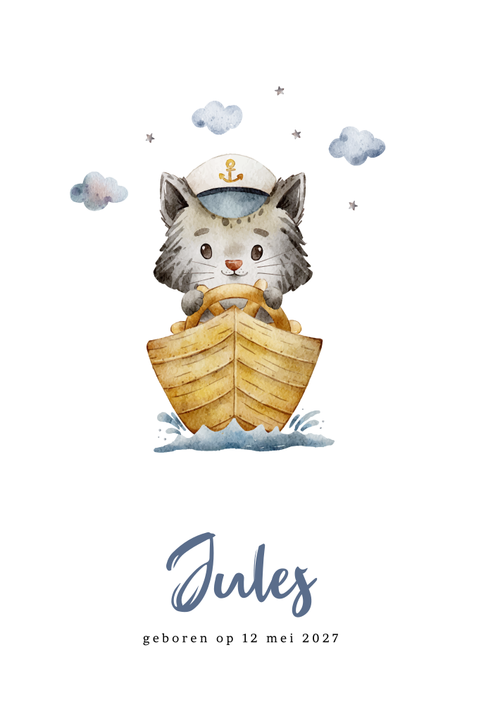 Lief geboortekaartje met een kat met kapiteinspet op aan het roer van een schip. Op de achterzijde staat de kat met een verrekijker en een matrozenpet. Pas de kaart naar wens aan en bestel een drukproef om het eindresultaat te bewonderen.