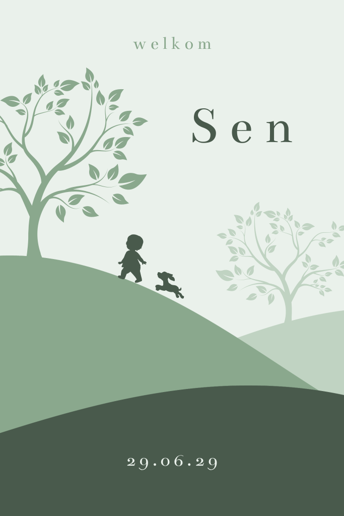 Lief geboortekaartje in groene tinten voor een klein, pasgeboren jongetje. Kondig de komst van je zoontje aan met dit silhouet geboortekaartje met rennend jongetje in een landschap vol heuvels en bomen. Een klein hondje rent vrolijk achter hem aan. Pas zelf de kleuren of lettertypes aan in onze editor en bestel een proefdrukje.