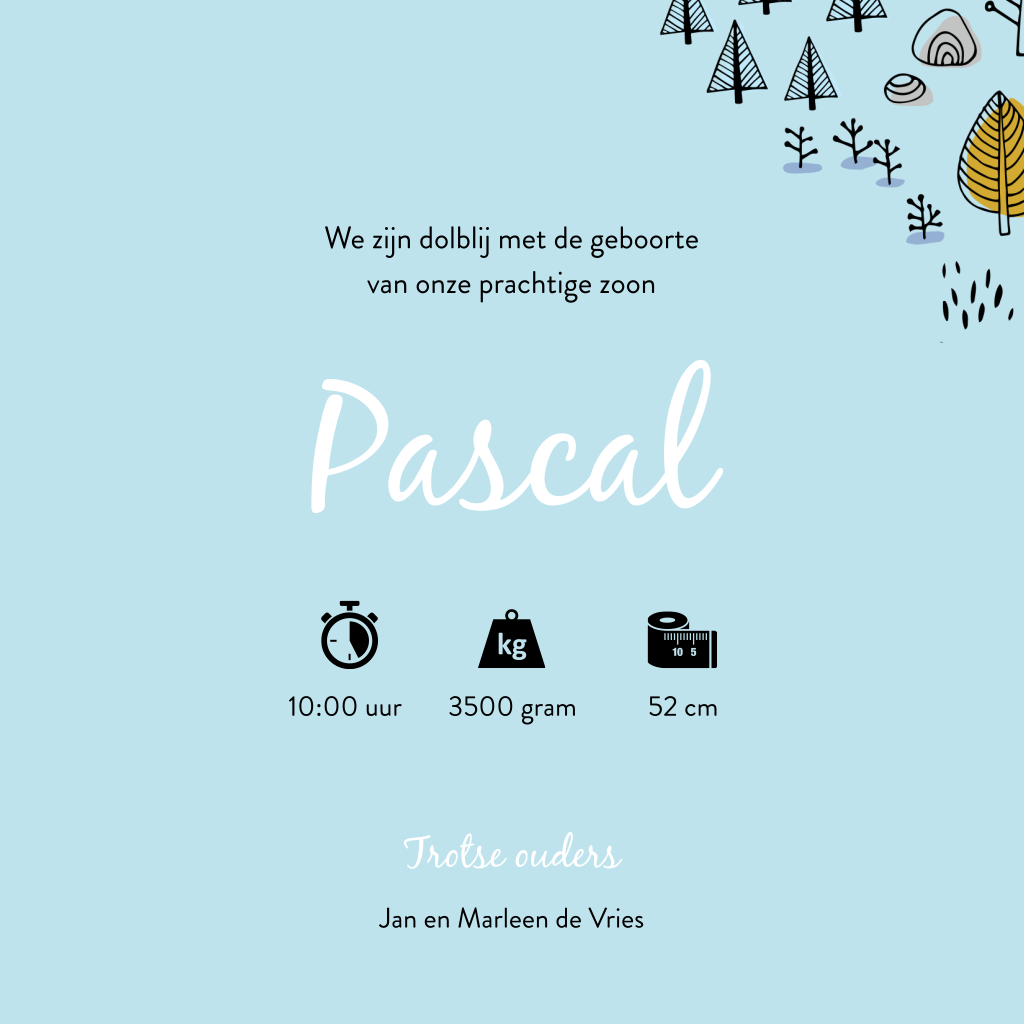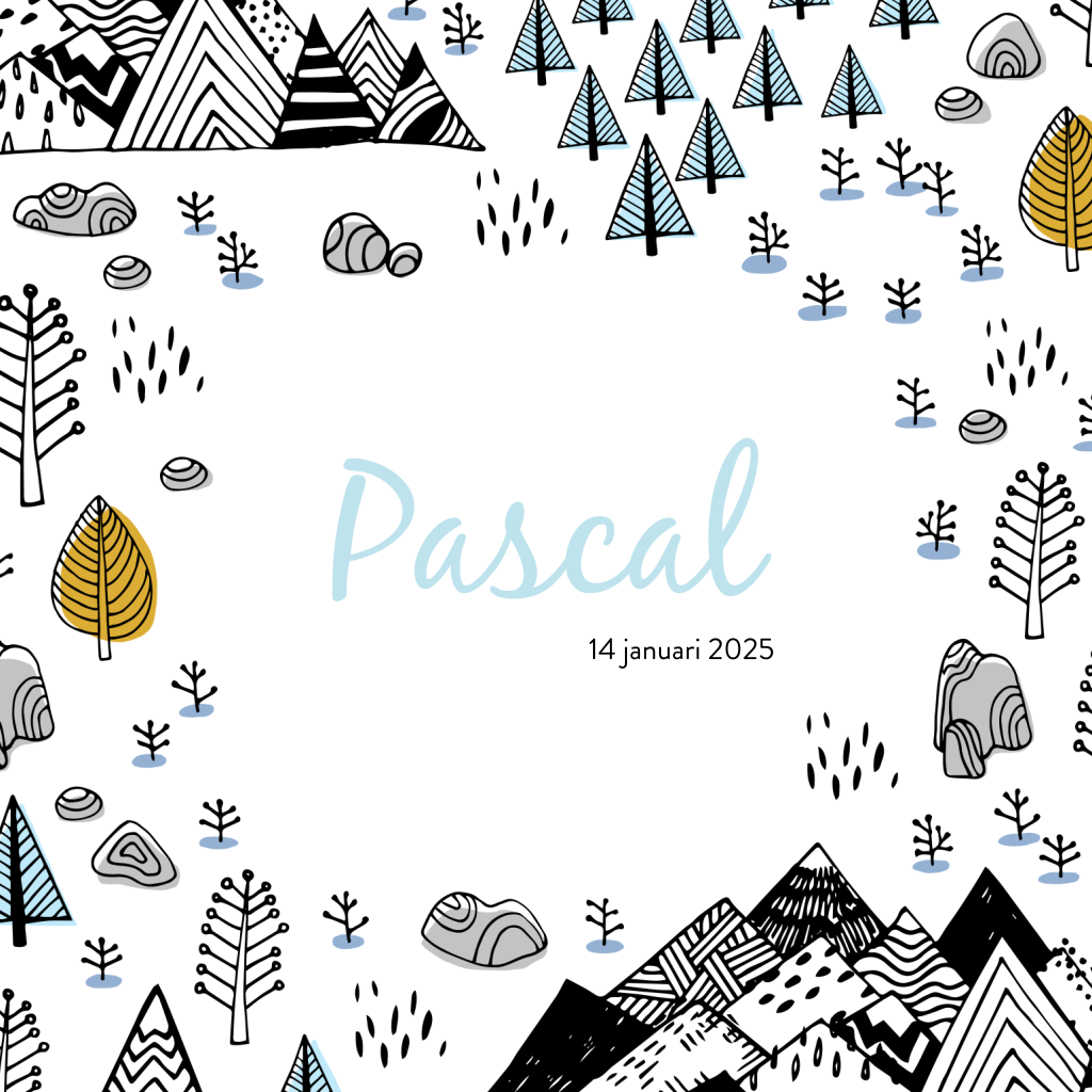 Winters geboortekaartje met geïllustreerd landschap en blauwe typografie. Wordt je zoontje in de winter geboren en ben je op zoek naar een vrolijk geboortekaartje? Ga dan voor dit vierkante kaartje met getekende boompjes, bergen en stenen. De naam van je pasgeboren zoontje komt in blauwe speelse typografie voorop en aan de binnenkant is er ruimte voor een kort gedichtje. Pas dit ontwerp eventueel naar je eigen smaak aan in onze ontwerptool. Bestel een proefdruk om het kaartje in het echt te bewonderen.
