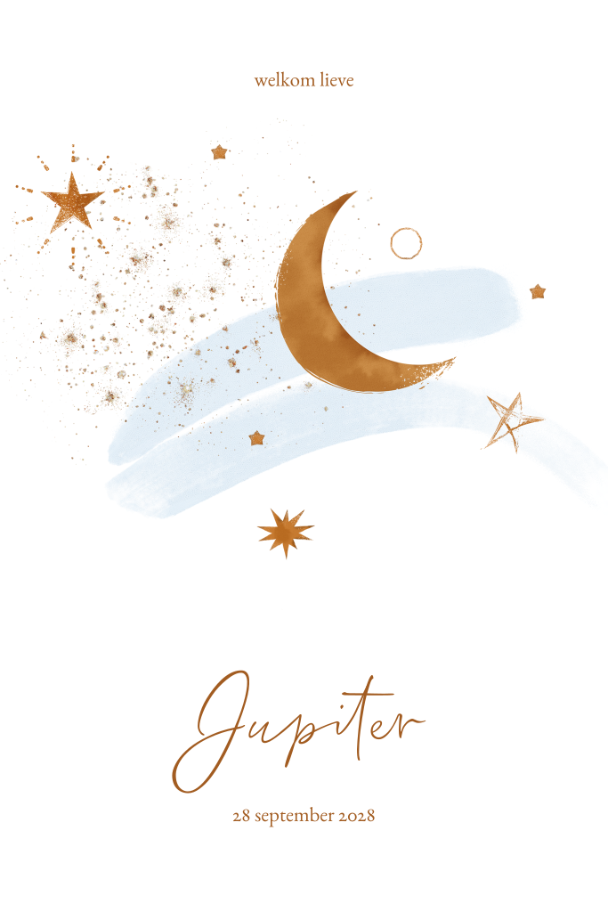 Geboortekaartje met maan, sterretjes in roestbruin en lichtblauw