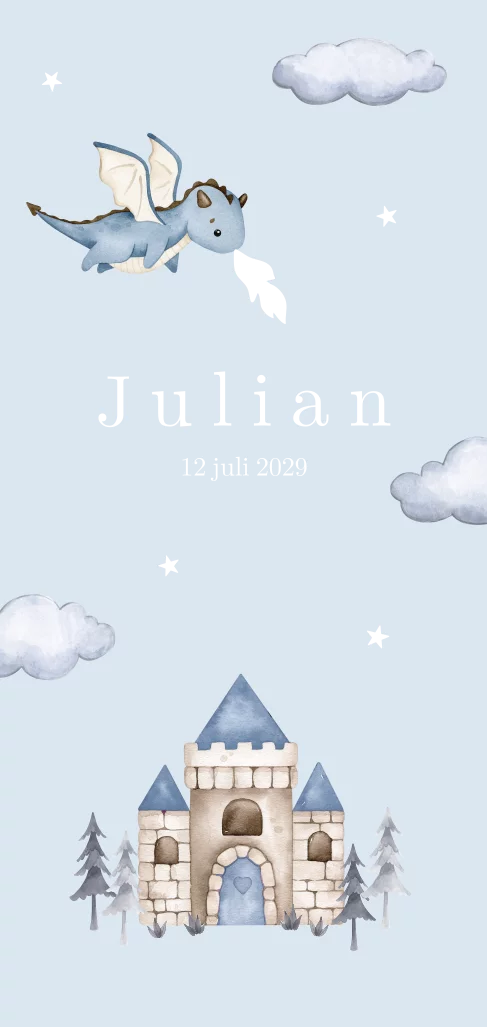 Verwelkom je zoon met dit blauwe sprookjesgeboortekaartje met schattig blauw draakje dat vuur spuwt. Tussen de bomen staat een kasteel. De naam, geboortedatum, sterren en het vuur worden met zilverfolie gedrukt. Maak gebruik van onze ontwerptool om het kaartje aan te passen naar jouw wensen, zoals het kiezen van een ander lettertype of achtergrondkleur.