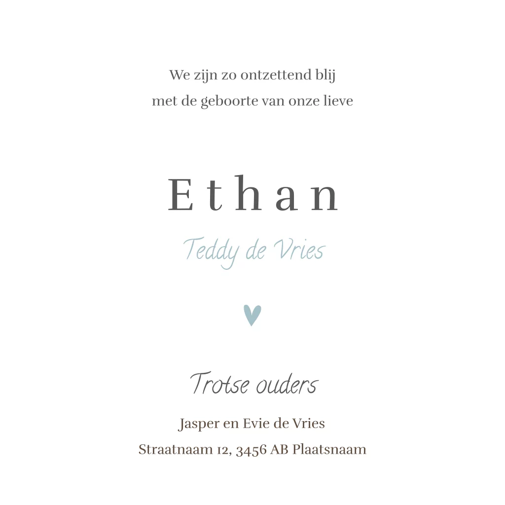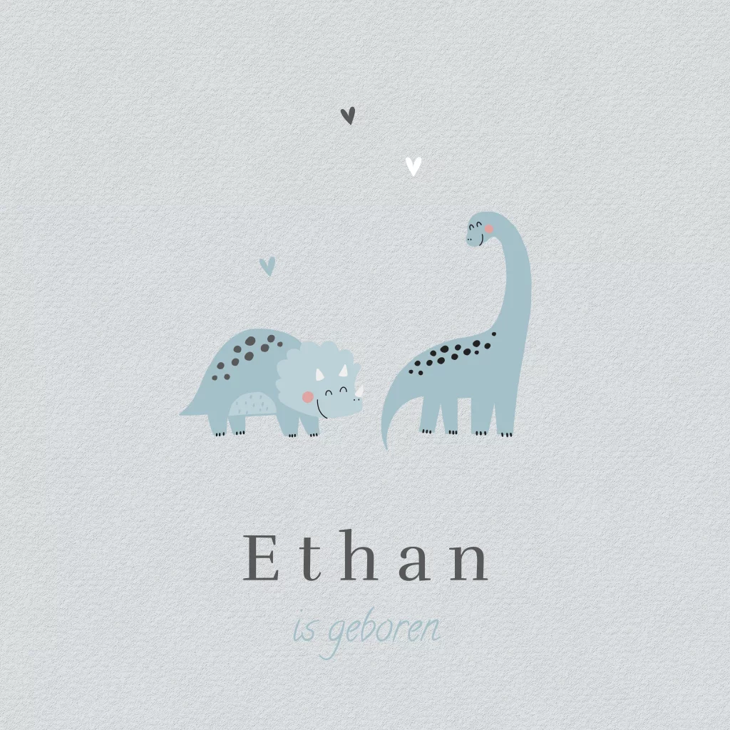 Op zoek naar een unieke geboortekaart voor een jongen? Deze kaart met lieve dinosaurussen in zachtblauwe pastelkleuren is perfect om de geboorte van jullie zoon aan te kondigen. De rustige grijze achtergrond laat de blauwe dino's extra goed tot hun recht komen. Met de vrolijke en speelse uitstraling, gecombineerd met subtiele hartjes, is dit kaartje ideaal voor ouders die iets origineels en schattigs willen. De naam van jullie kindje staat centraal in het midden. Bestel nu deze schattige geboortekaart en verwelkom je kleintje in stijl!