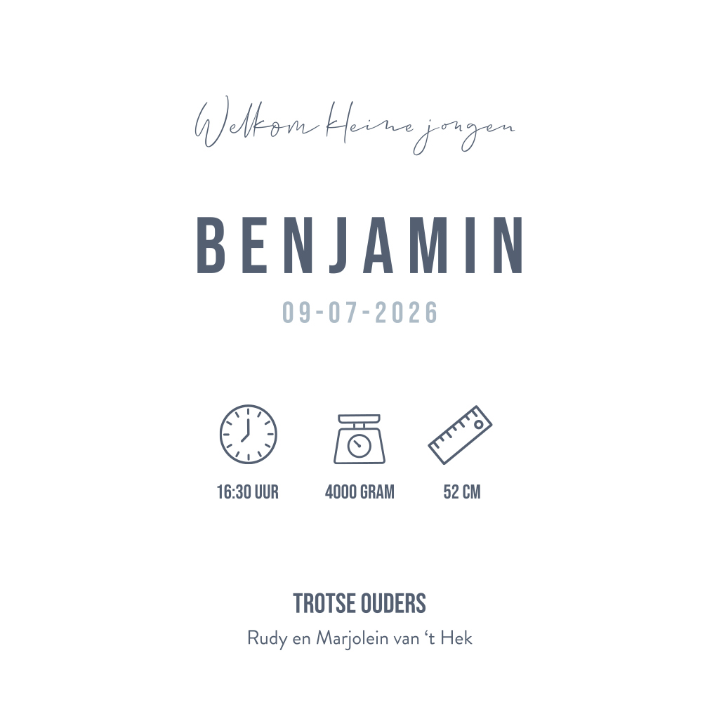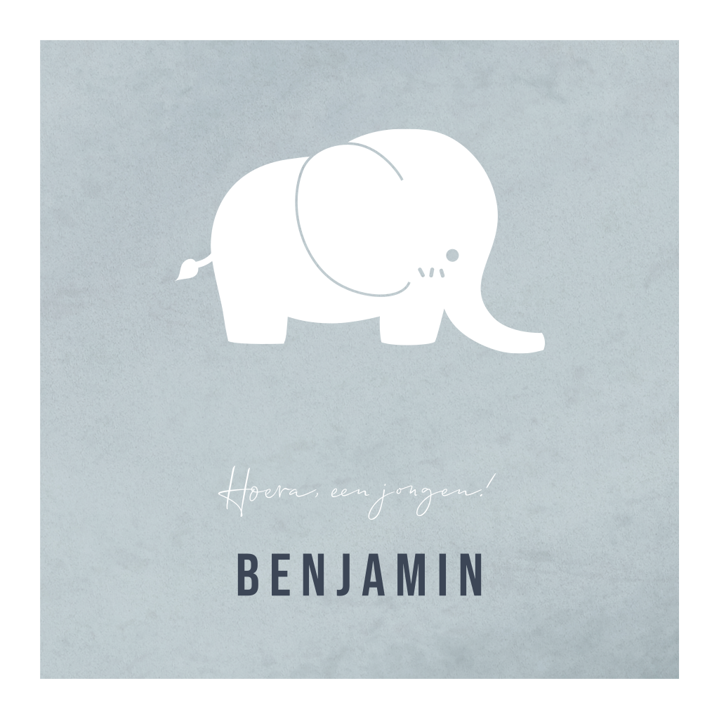 Blauw waterverf geboortekaartje met olifant. Kies voor dit hippe geboortekaartje om de geboorte van jullie zoon aan te kondigen. Een olifant met grijsblauwe waterverf achtergrond. Pas de kaart naar wens aan en bestel een drukproef.