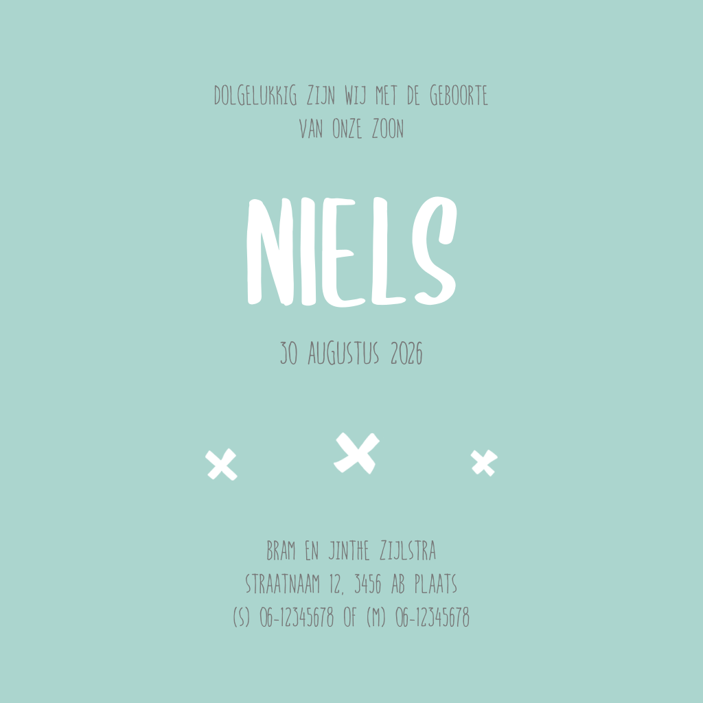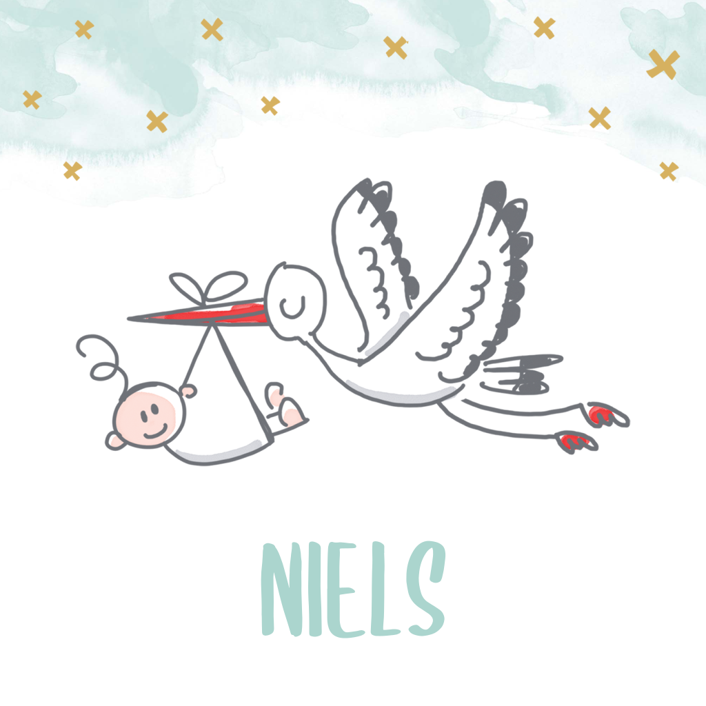 Blauw waterverf geboortekaartje met ooievaar en baby jongen in een draagdoek. Dit lieve geboortekaartje met waterverf en ooievaar voorop is een topcombinatie met de okergele accenten. De kaart is aan de binnenzijde versierd met kruisjes. Verander zelf gemakkelijk de teksten in onze ontwerptool en je eigen gemaakte geboortekaartje is klaar.