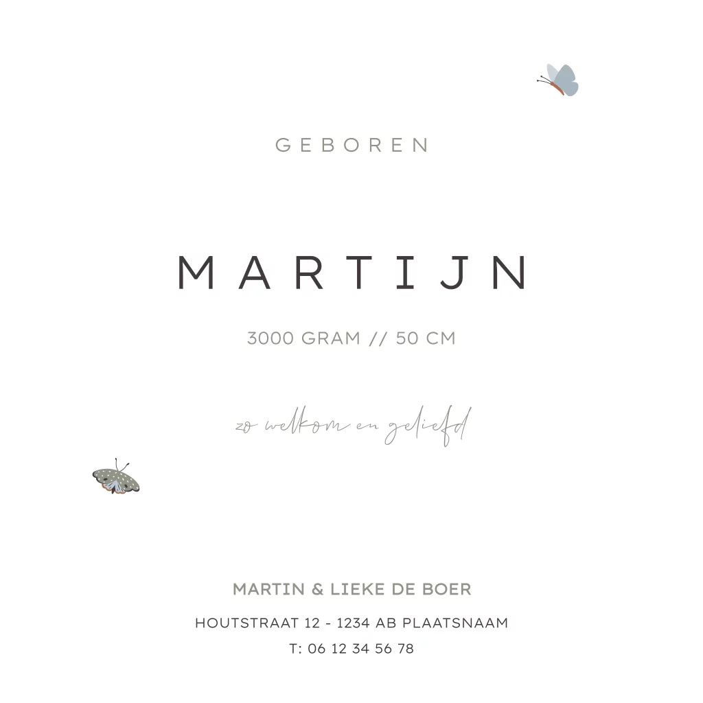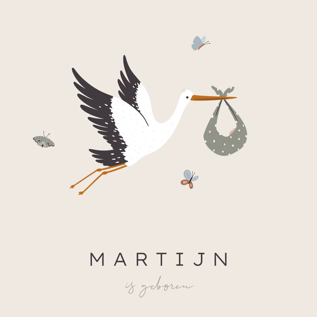 Een schattig geboortekaartje voor een jongen, met een vriendelijke ooievaar die een baby in een groene knapzak brengt. Binnenin zie je een wiegje met een blauw dekentje en vrolijke ballonnen, omringd door speelse vlinders. Pas het kaartje eenvoudig aan met onze editor en bestel een proefdruk.