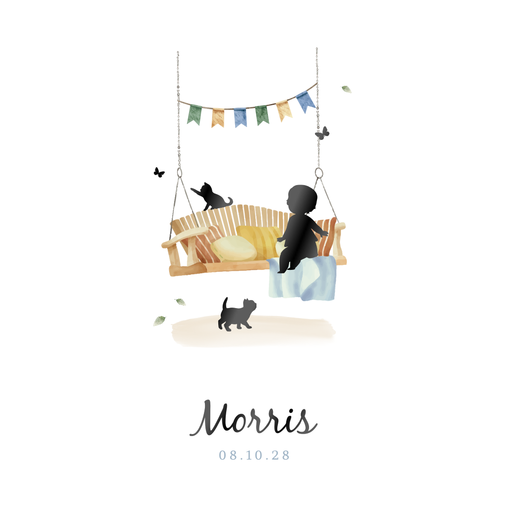 Lief geboortekaartje met hoogglans silhouetjes en waterverf illustratie. Op een geschilderd bankje zit een klein jongetje, samen met twee lieve kittens. Kondig de geboorte van jouw zoontje aan met dit leuke ontwerp! De hoogglans silhouetjes kun je eventueel van kleur veranderen. Of wat denk je van goud- of koperfolie in plaats van hoogglans? Maak dit kaartje helemaal naar je eigen zin in onze handige editor en bestel een proefdruk.