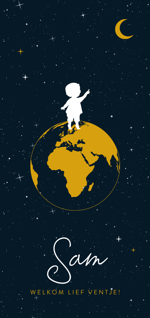 Geboortekaartje silhouette baby jongetje op wereldbol. Silhouetjes op geboortekaartjes zijn helemaal hip. Bij koningkaart hebben we een kaart ontworpen waar we diverse trends samenvoegen. Namelijk dit donkerblauwe, langwerpige geboortekaartje met wit silhouetje van een jongetje op een goudkleurige wereldbol wijzend naar de maan. Zo heb je drie trends in één, silhouetjes, maan en wereldbol. Op de achterkant kun je de teksten naar wens aanpassen en een leuk gedichtje plaatsen.