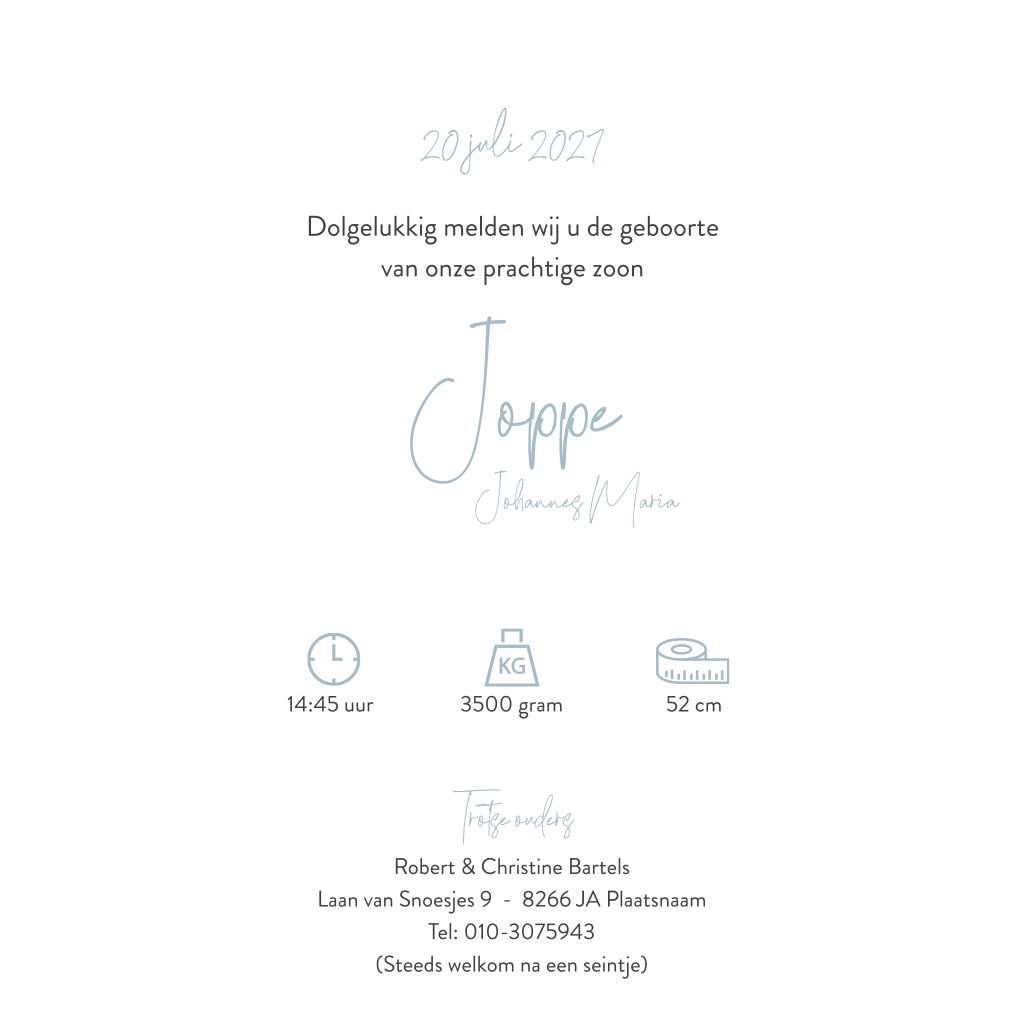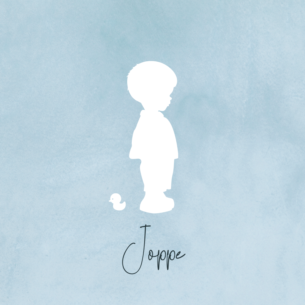 Hip geboortekaartje met lichtblauwe waterverf achtergrond en een klein jongetje in wit silhouet op de voorzijde.