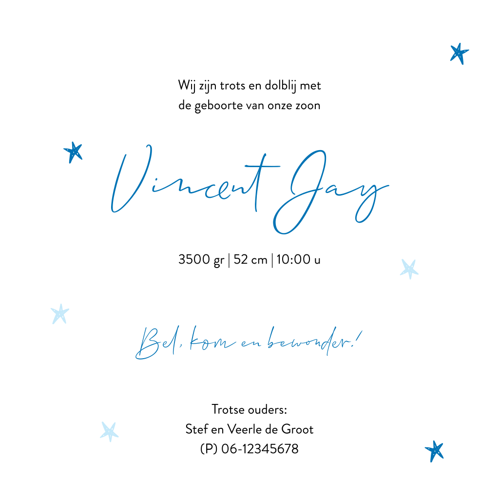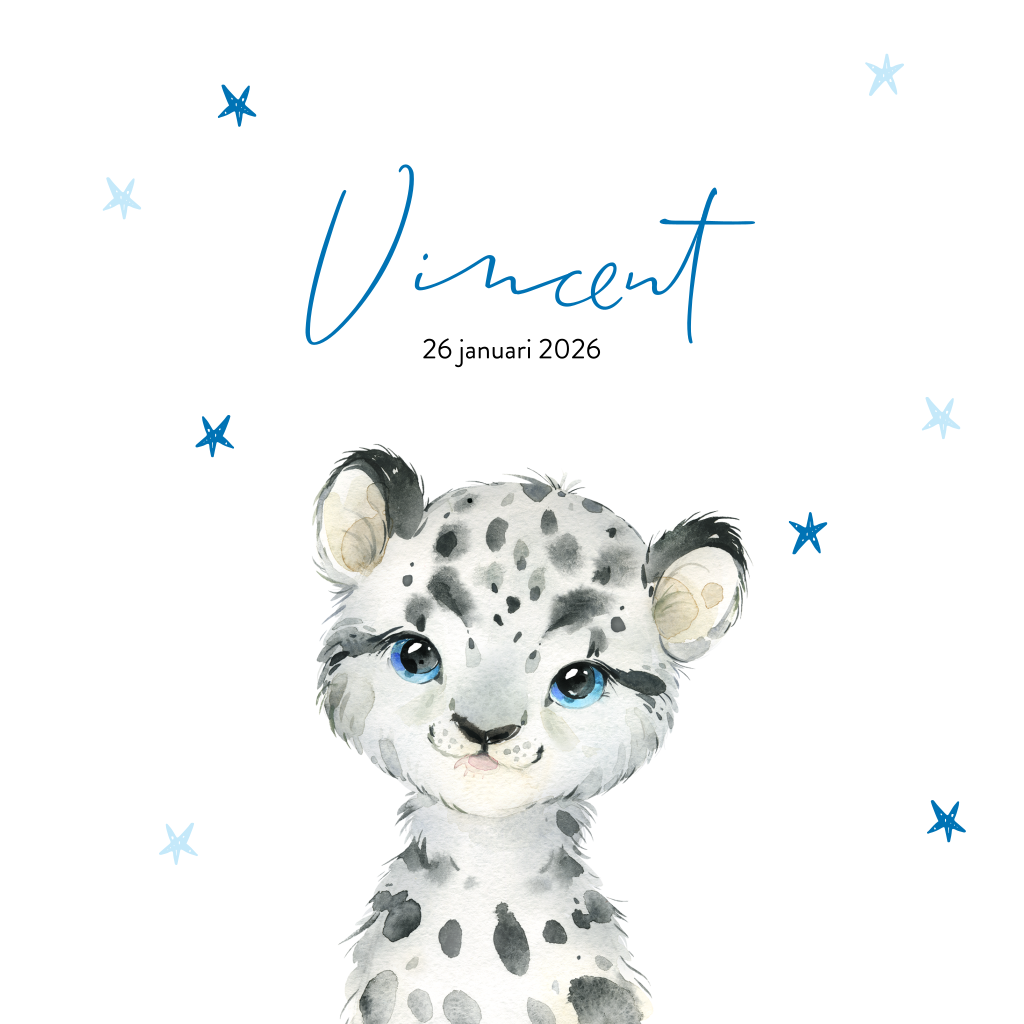 Winters geboortekaartje met sneeuwluipaard en blauwe sterretjes. Krijg je een zoontje in de winter en zoek je een geboortekaartje dat is geïnspireerd op dit seizoen? Kies dan dit lieve kaartje met een illustratie van een sneeuwluipaard en blauwe sterretjes. Aan de binnenkant is er ruimte voor alle info over je pasgeboren zoontje en voor een kort gedichtje of een mooie quote. Pas dit ontwerp eventueel naar je eigen smaak aan in onze ontwerptool.