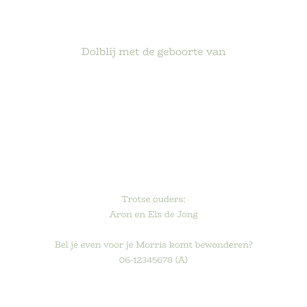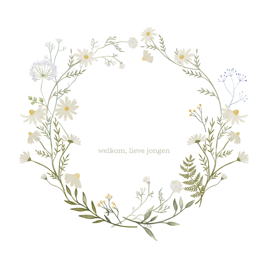 Op zoek naar een stijlvol en lief geboortekaartje voor je aanstaande zoontje? Ga voor dit botanische kaartje met gedroogde, witte bloemen en goudfolie hartjes. Pas dit ontwerp zelf aan in onze editor, pas bijvoorbeeld de achtergrondkleur of foliekleur aan.