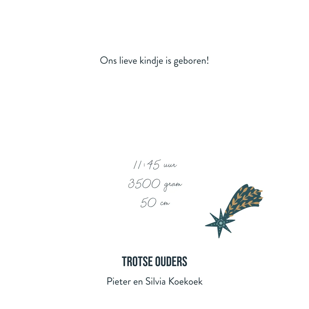 Dit geboortekaartje universum met een stoer design vol zonnen, manen en sterren. De diepe nachtblauwe achtergrond in combinatie met gouden accenten geeft het kaartje een luxe en bijzondere uitstraling. Perfect voor ouders die op zoek zijn naar een origineel en stijlvol geboortekaartje met ruimte thema. Voeg eenvoudig de naam en geboortedatum van jullie kindje toe en maak er een persoonlijk kaartje van.