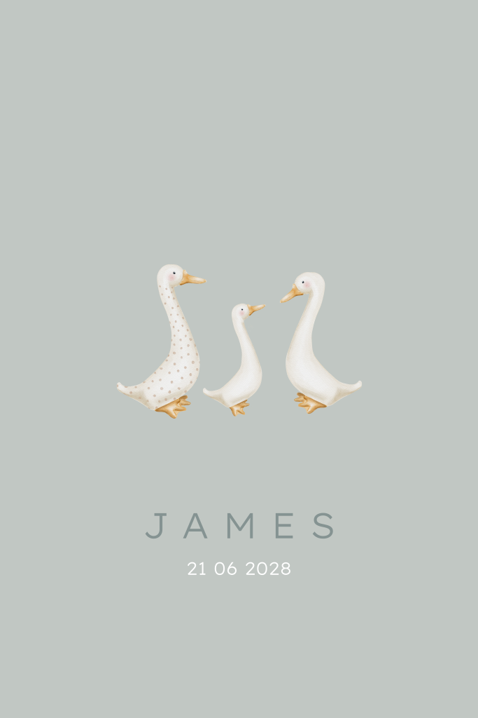 Lief zachtgroen geboortekaartje met drie gansjes voorop. De kleinste gans staat in het midden tussen de twee grotere gansjes. Wat een lieve familie! Dit minimalistische ontwerp kunt het ontwerp eenvoudig aanpassen met de editor. Misschien wil je een andere kleur achtergrond of lettertype? Open de tool en pas naar wens aan.