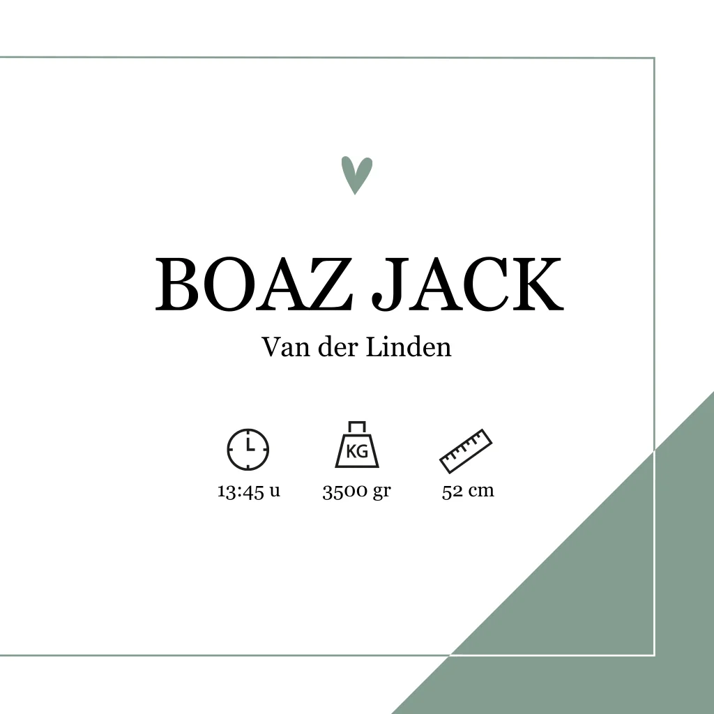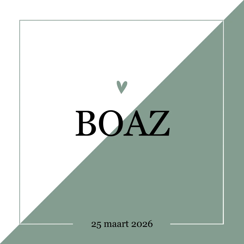Geometrisch geboortekaartje met groen vlak en een hartje. Hip strak geboortekaartje met schuine vlakken in groen-grijze kleur. Daaromheen een kader met onderin de datum. Wil je liever een andere kleur? Je kunt de kleur eenvoudig in de ontwerptool aanpassen.