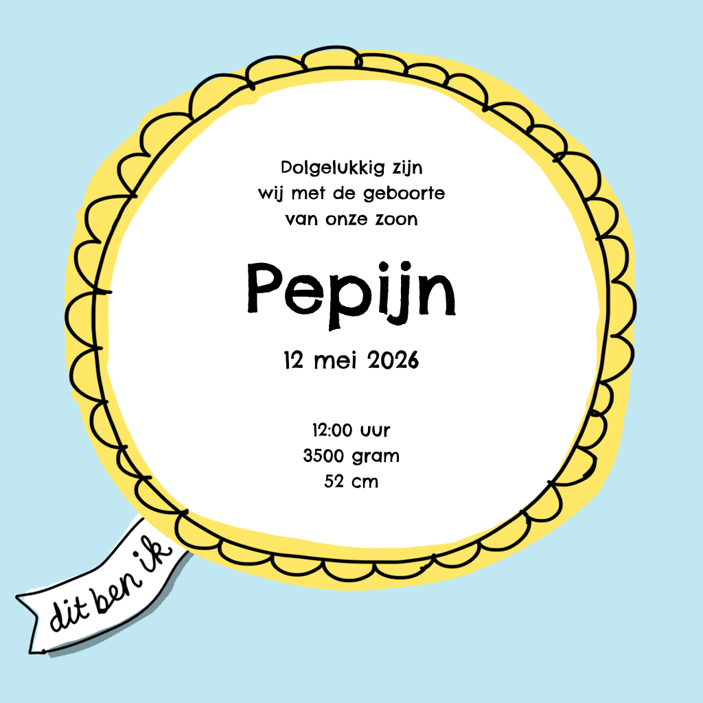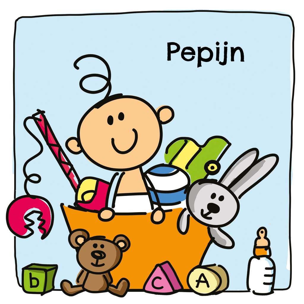 Geboortekaart blauw met vrolijk baby jongetje in een speelgoeddoos. Je ziet blokken, een teddybeer, fles en nog veel meer. Aan de binnenzijde komt het speelgoed ook weer terug. Daarnaast zie je een rozet, met daarin alle geboortegegevens van jullie kleine man. Pas de teksten gemakkelijk aan om het ontwerp helemaal uniek te maken.