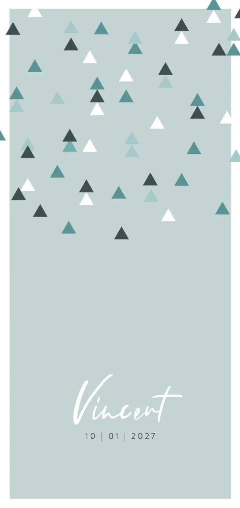 Een langwerpig grafisch geboortekaartje in een blauwgroene kleur met print van driehoekjes. Op de voor- en achterzijde versieren kleine driehoekjes in verschillende tinten de kaart. Ook boven de geboortegegevens staan de driehoekjes. Een stoer geboortekaartje voor je pasgeboren zoontje. Bestel een proefdruk om dit ontwerp in gedrukte vorm te kunnen bewonderen.