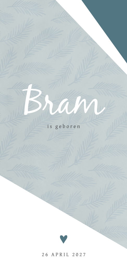 Stoer geboortekaartje voor de geboorte van jouw zoon. De kaart heeft een hip lettertype voor de naam van je zoontje. Als achtergrond heeft de kaart een mooi patroon van blauwe veren. De geometrische vlakken maken het ontwerp helemaal af.