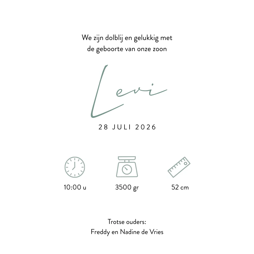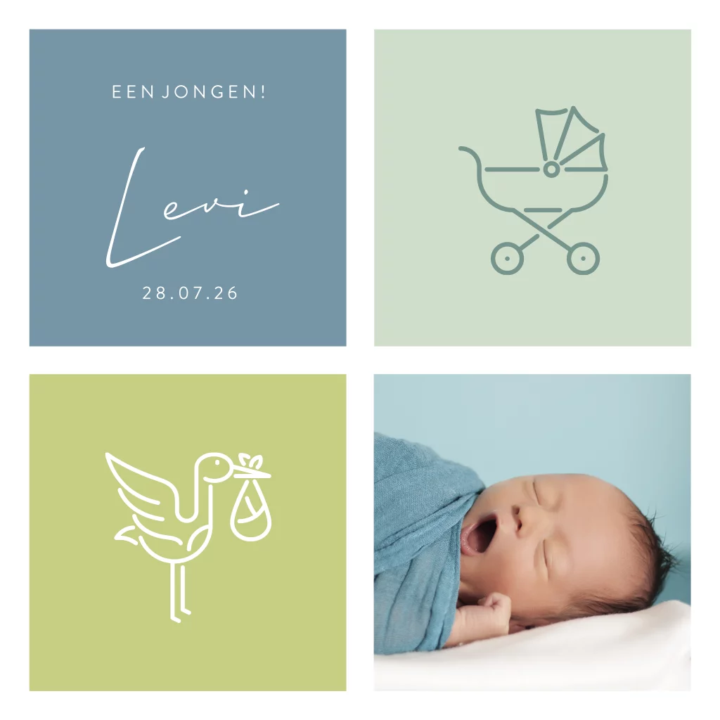 Vierkant grafisch geboortekaartje verdeeld in vier vlakken in verschillende kleuren. Je kunt de kleuren groen en blauw zelf aanpassen als ook de illustratie van de ooievaar en en de tekst voorop de kaart. Er is ook ruimte voor een eigen foto van je pasgeboren zoontje. Dus zoek je nog een mooi strak geboortekaartje voor je zoon? Dan kun je dit ontwerp heel eenvoudig naar wens aanpassen.