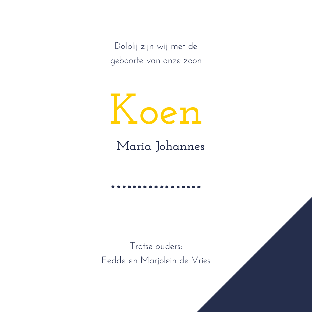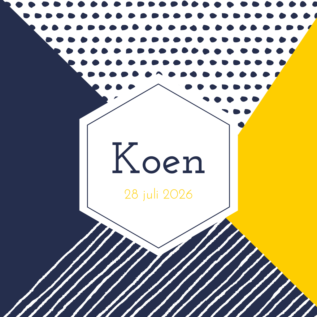 Grafisch geboortekaartje met donkerblauwe en gele vlakken. Zoek je een modern geboortekaartje voor de geboorte van jouw zoontje? Bij dit geometrische geboortekaartje zie je op de voorkant een witte zeshoek staan met daaromheen verschillende vlakken in de kleuren donkerblauw en geel. De vlakken hebben verschillende patroontjes als stipjes en strepen. De streepjes en stipjes komen aan de binnenkant terug. Verder kun je nog een lief gedichtje plaatsen aan de binnenkant.