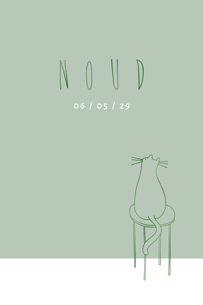 Vrolijk geboortekaartje met getekende kat op een krukje in donkergroene hoogglans. De achtergrond is pastelgroen, maar deze kun je natuurlijk zelf aanpassen in onze handige editor. Op de achterkant van dit enkele ontwerp komt de kat terug en is er ruimte voor alle geboortegegevens van je kindje. Bestel een proefdrukje van dit leuke, hoogglans geboortekaartje om deze in het echt te kunnen bewonderen.