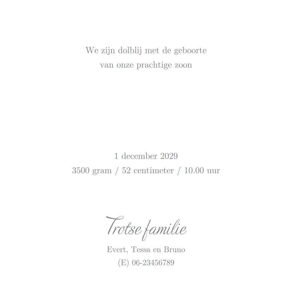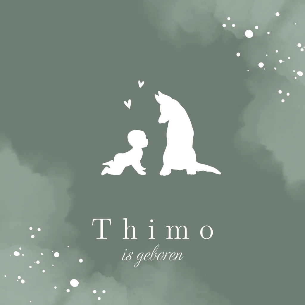 Op zoek naar een lieve geboortekaart voor je aanstaande zoon met een hondje erop? Ga voor dit groene ontwerp met silhouetjes van een baby en hond in goudfolie. De spetters, hartjes en waterverf versieren de rest van de kaart. Aan de binnenzijde van dit vierkante kaartje kun je een mooie foto en de geboortegegevens van je zoontje plaatsen. Pas dit geboortekaartje met silhouetjes zelf aan in onze editor en bestel een proefdrukje.
